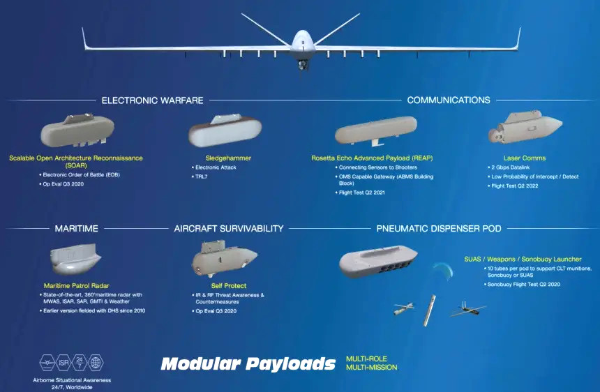 There are a number of publicly known podded systems for the reaper that feature integrated pylons, such as the Scalable Open Architecture Reconnaissance (SOAR) pod and the Sledgehammer electronic warfare pod, both from L3Harris. There is also the NATO Pod, a modular design capable of being configured to carry a variety of intelligence, surveillance, and reconnaissance (ISR) sensor payloads, from Spain’s SENER Group.