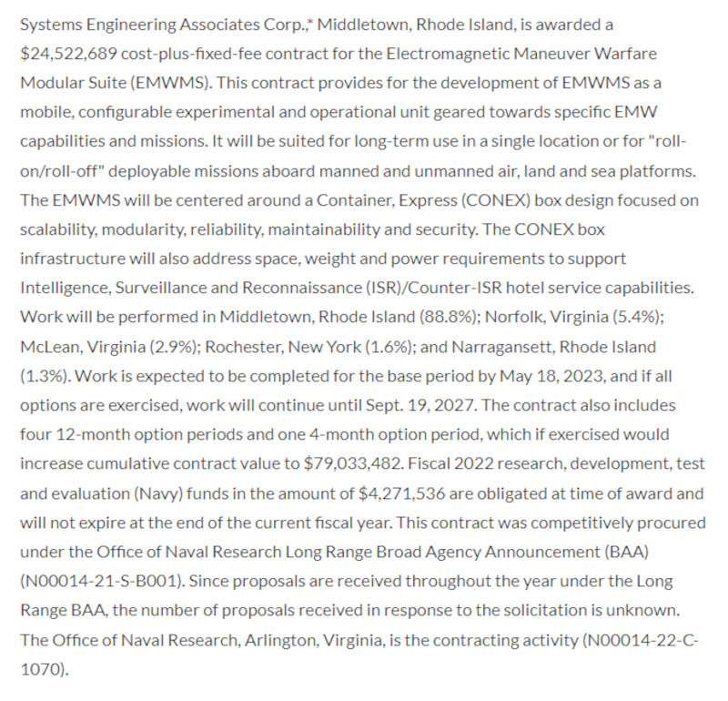 Details about what is called the Electromagnetic Maneuver Warfare Modular Suite (EMWMS) were contained within the Pentagon’s daily contracting notice yesterday. Systems Engineering Associates Corp. has now received a contract from the Office of Naval Research (ONR) worth up to just over $24.5 million for work on the EMWMS.
