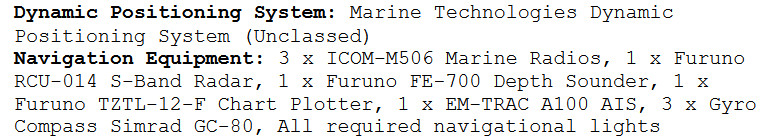 No mention is made in the listing about Nomad’s past as an experimental uncrewed surface vessel (USV) with semi-autonomous capabilities, and there is no indication that the ship retains any of that functionality. As seen below, the only electronics of note in the information GSA provides about the ship are a Marine Technologies Dynamic Positioning System (which is expressly noted to be an unclassified piece of equipment) and various commercial radios, radars, other navigation aids, and transponders.