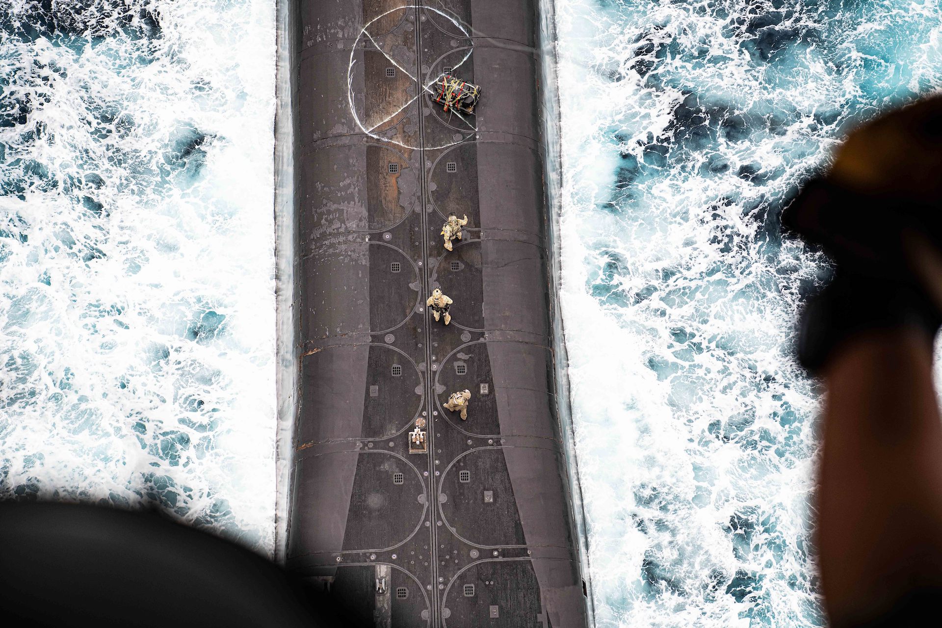 A large circled x appears to have been painted on the submarine’s upper hull, where it’s missile tubes are, as an improvized target for winching-down loads.