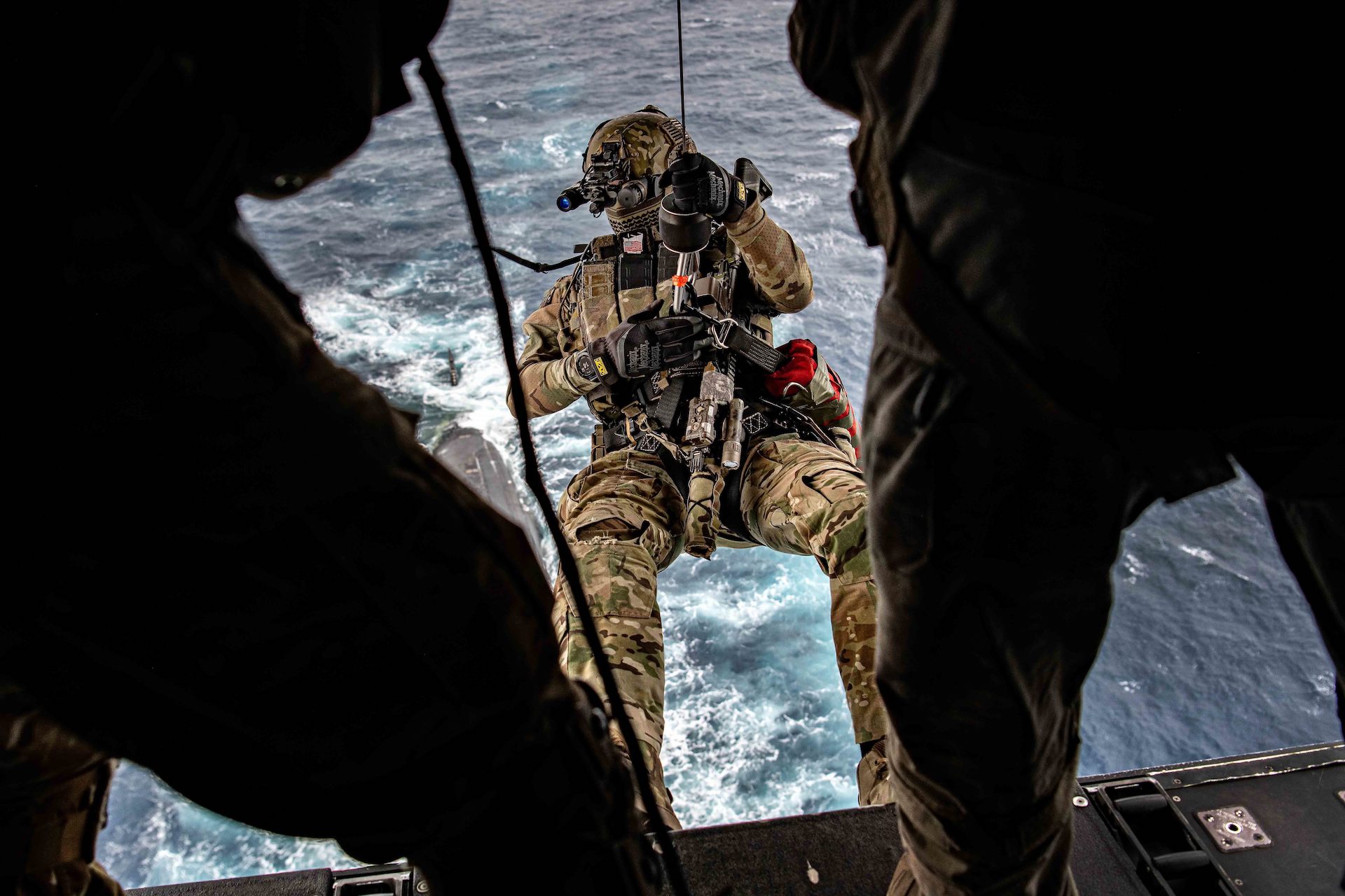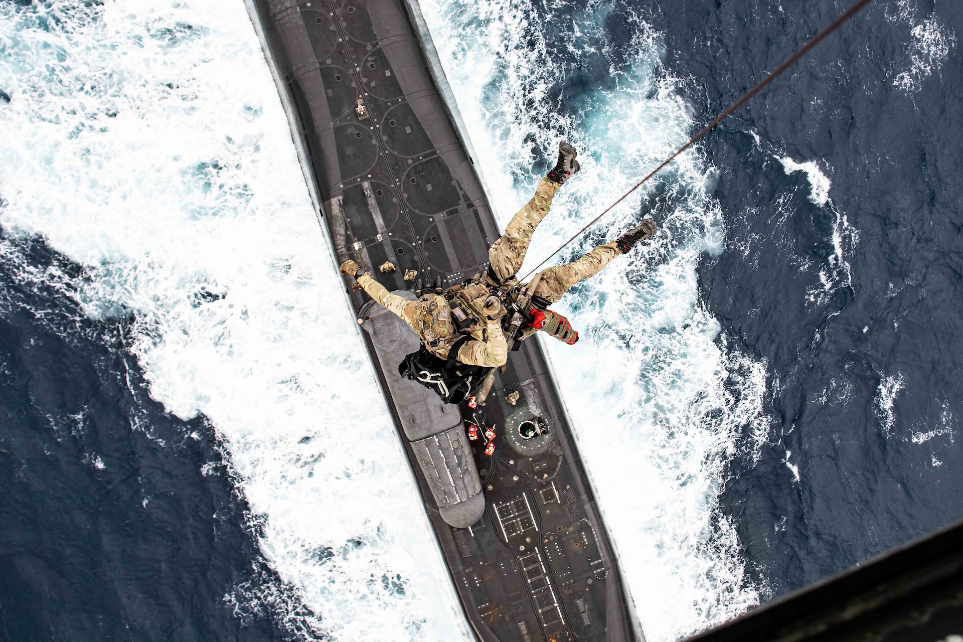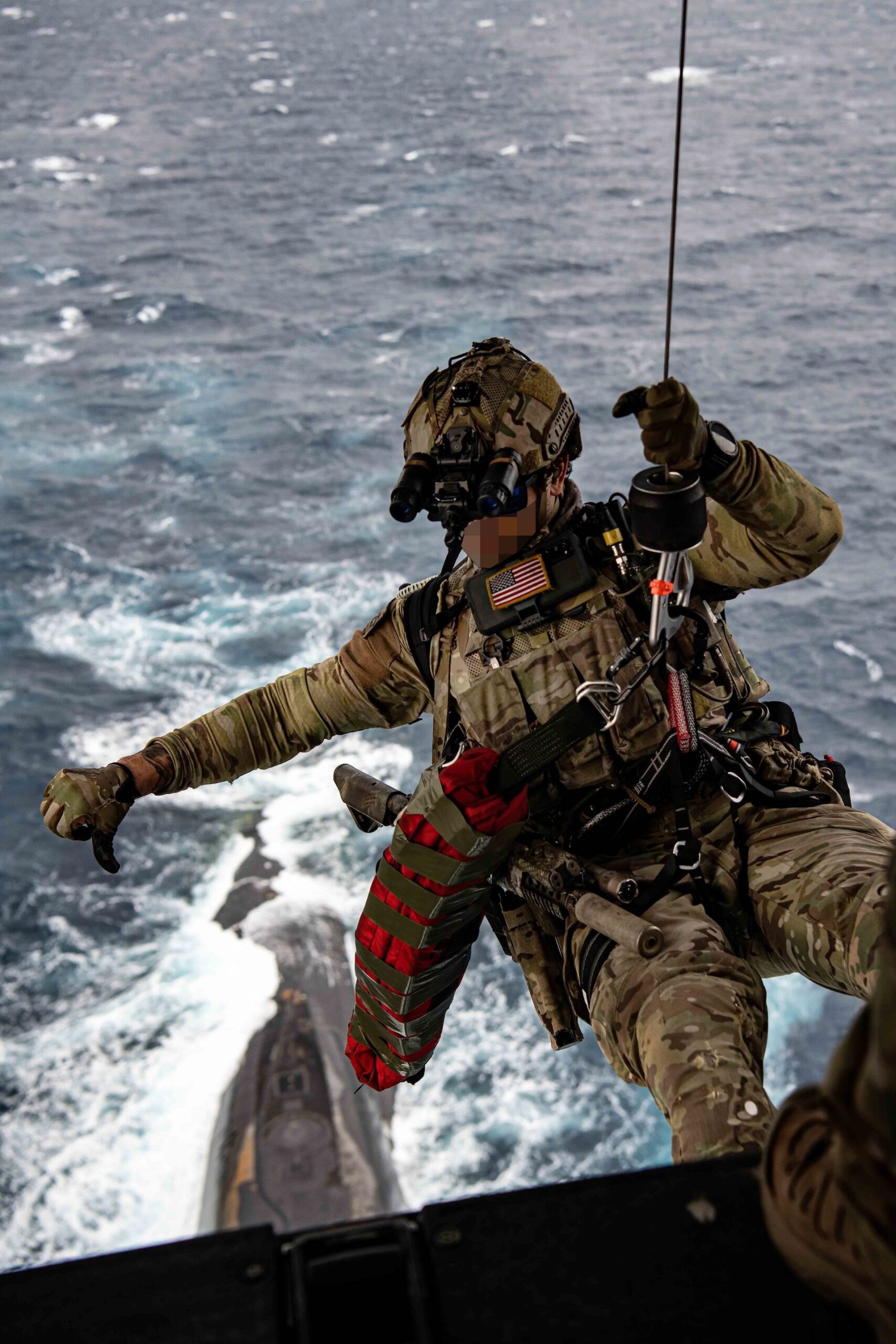 As you can see below, a CV-22 Osprey, assigned to the USAF’s 7th Special Operations Squadron, 352nd Special Operations Wing, approaches USS Florida. Navy SEALs then prepare to be winched down onto the submarine.