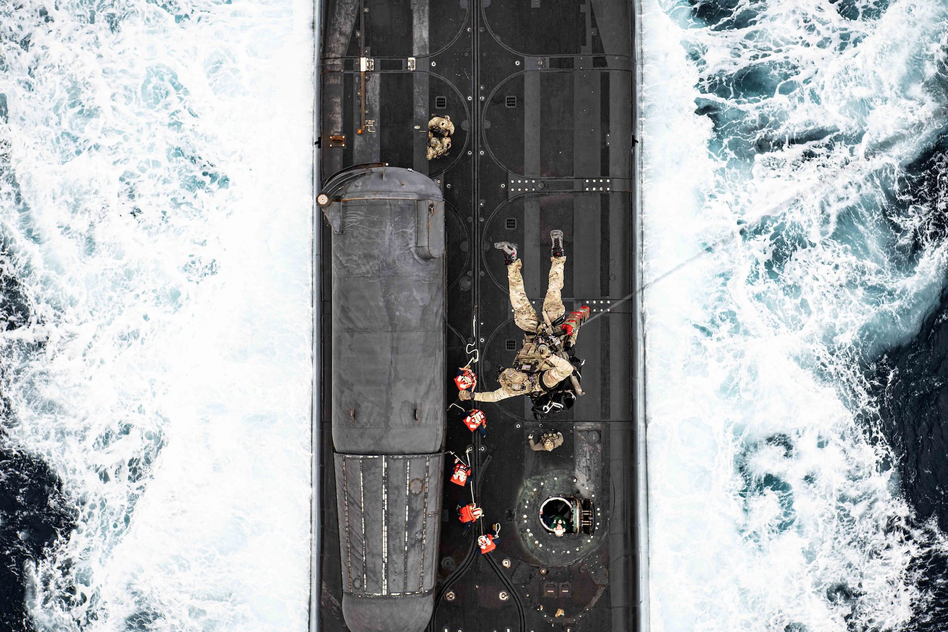 While the rappelling shots do appear to feature Navy SEALs, a second set of images released by the DoD shows Navy SEALs and Greek Special Operations Forces (SOF) landing a Combat Rubber Raiding Craft (CRRC) aboard the submarine.