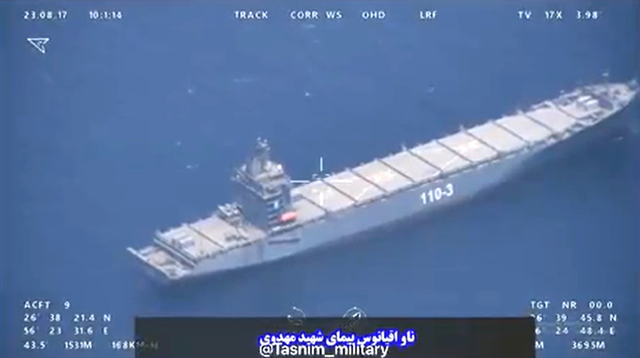 Pictures and video footage Iran released via the semi-official Tasnim News Agency yesterday show one of the country’s new sea base-esque vessels, the Shahid Mahdavi, and other vessels, supported by drones flying above, very closely shadowing the U.S. naval contingent as it passed into the Persian Gulf last week. The actual transit occurred on August 17.