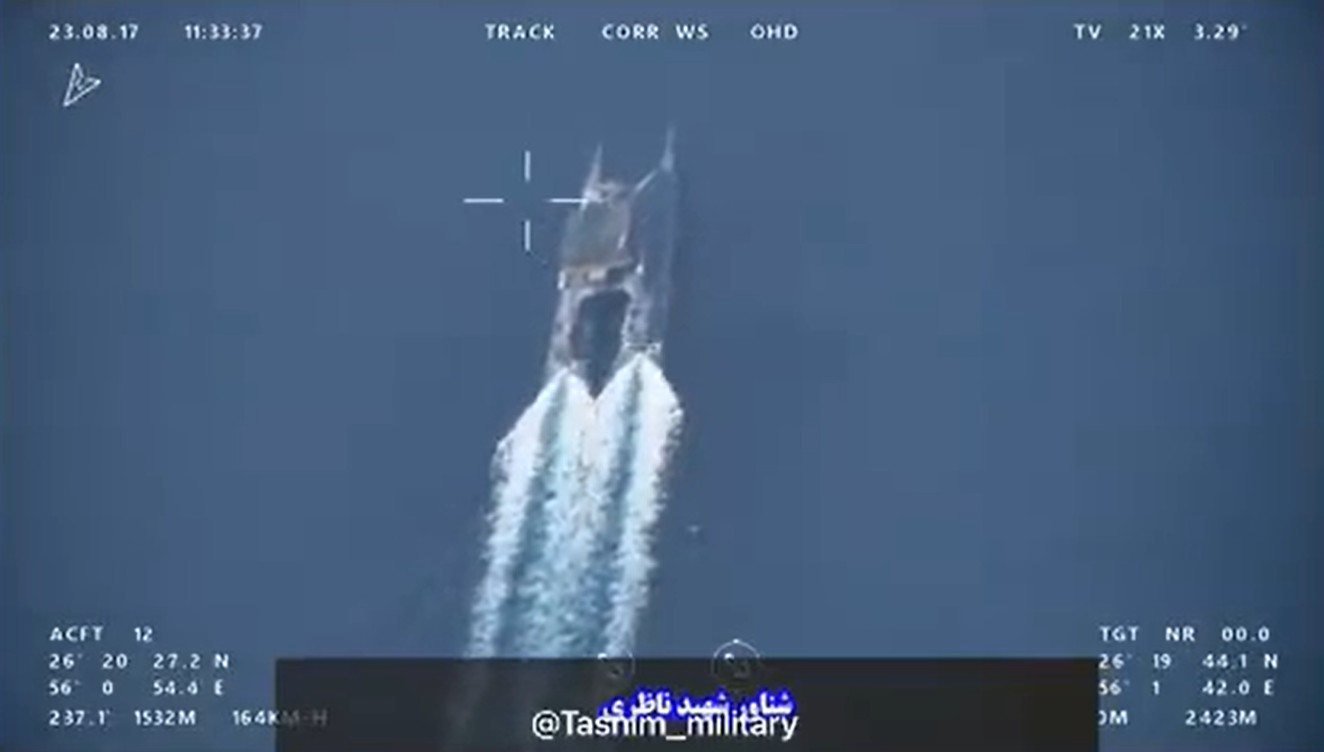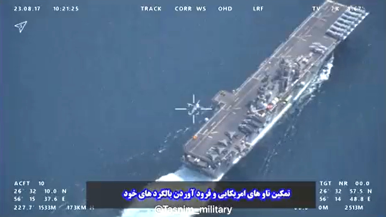 In addition to the Shahid Mahdavi, the Iranian imagery from last week shows one of the IRGC-N’s curious catamaran naval vessels, likely the lightly-armed Shahid Nazeri based on its largely open rear end and centrally located helipad, along with multiple small boats, also being used to monitor American vessels.