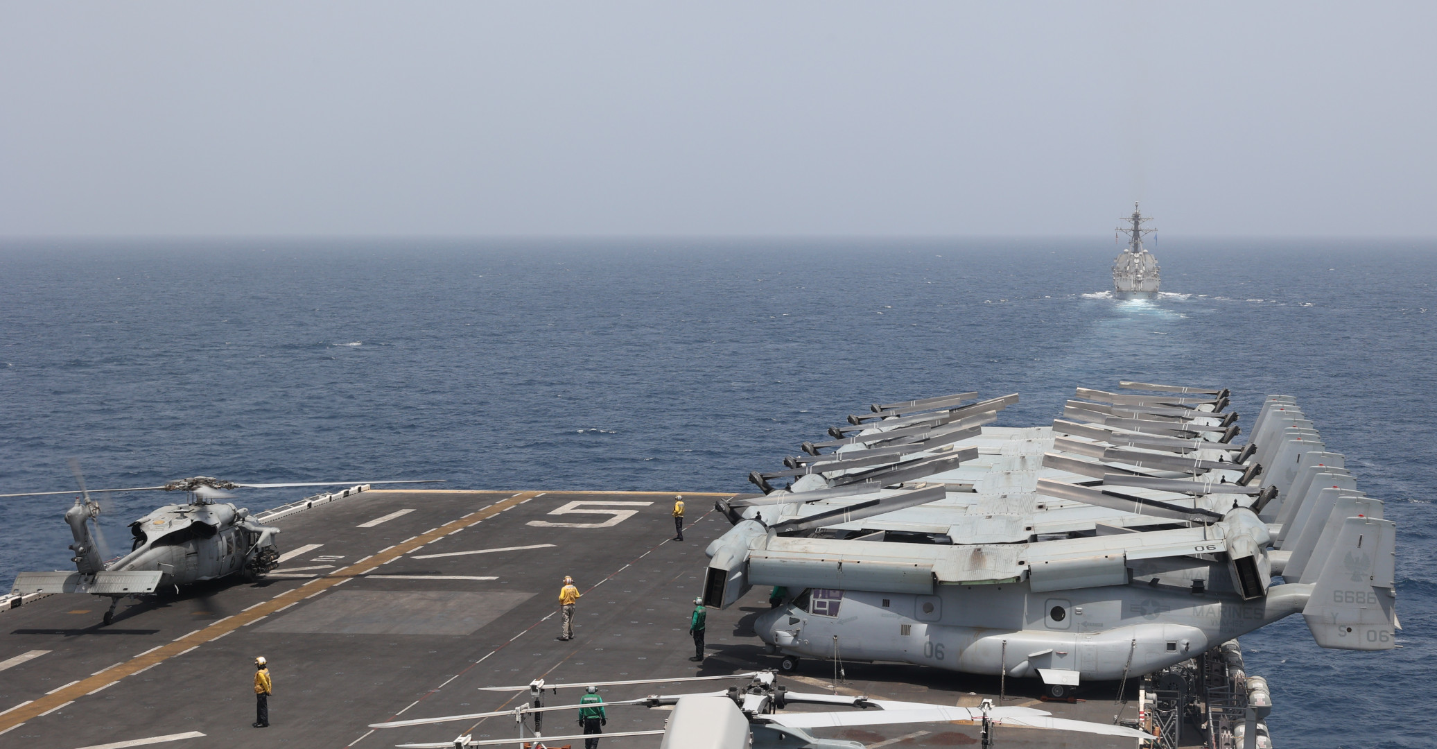 “The story is untrue. No helo returned early to deck during the transit, other than to refuel,” U.S. Navy Cdr. Rick Chernitzer, a spokesperson for U.S. Fifth Fleet, headquartered in Bahrain, told The War Zone in a statement. “The US Navy will continue to fly and sail where international law allows.”