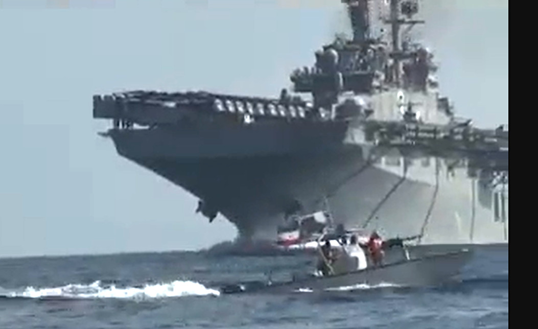 At one point in the Iranian video clips of the transit, seen below, a member of the IRGC-N can be heard hailing the U.S. Navy vessels in English.