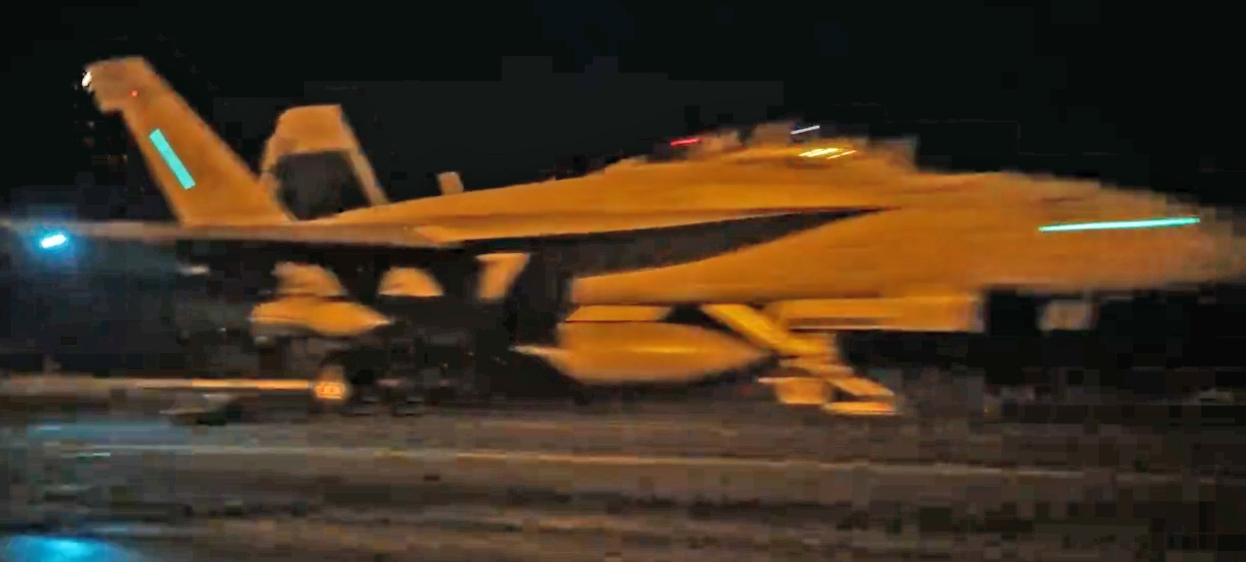 Video posted by CENTCOM shows Super Hornets, a Growler, and an E-2 Hawkeye launching off of the ‘IKE.’ The video shows an F/A-18F with what appears to be a 2,000lb GBU-31 JDAM with a BLU-109 ‘bunker buster’ bomb body launching off the ship.
