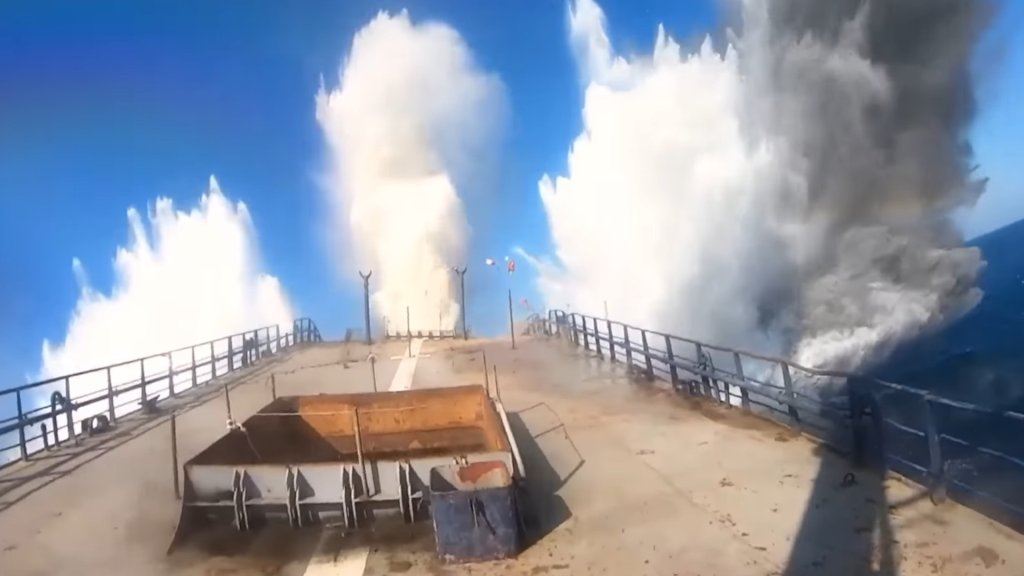 Regardless, the weapon then course corrects onto a trajectory where it hits the water and then detonates near the hull below the waterline. This ‘heaves’ the ship, breaking it in two or causing otherwise massive damage. Even a near miss would likely result in a ‘mission kill’ where the ship’s systems are disabled to the point that it is no longer combat effective.