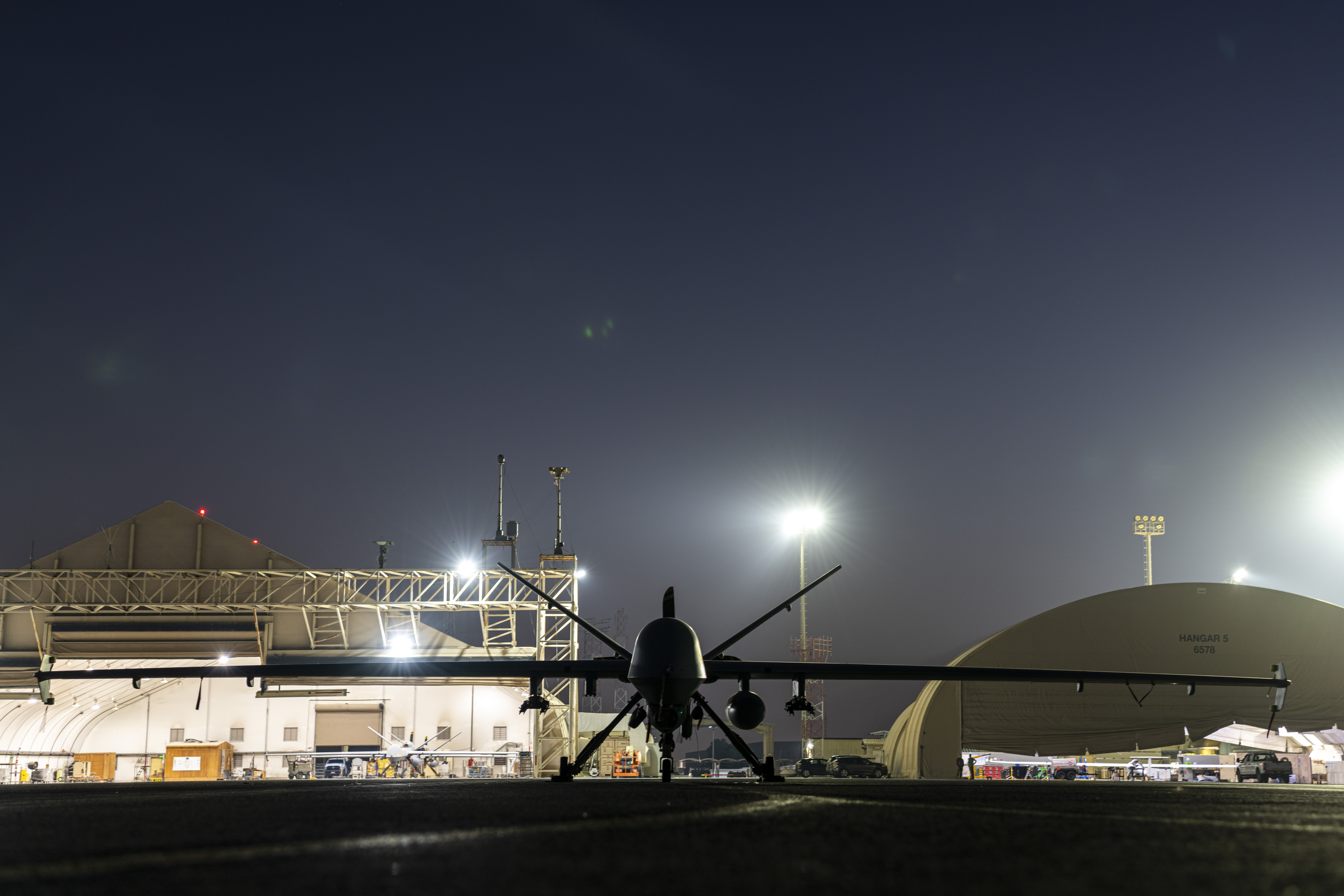 Another photo shows an MQ-9 Reaper on the flight line in front of the ULTRA, with another two Reapers in an adjacent hangar.