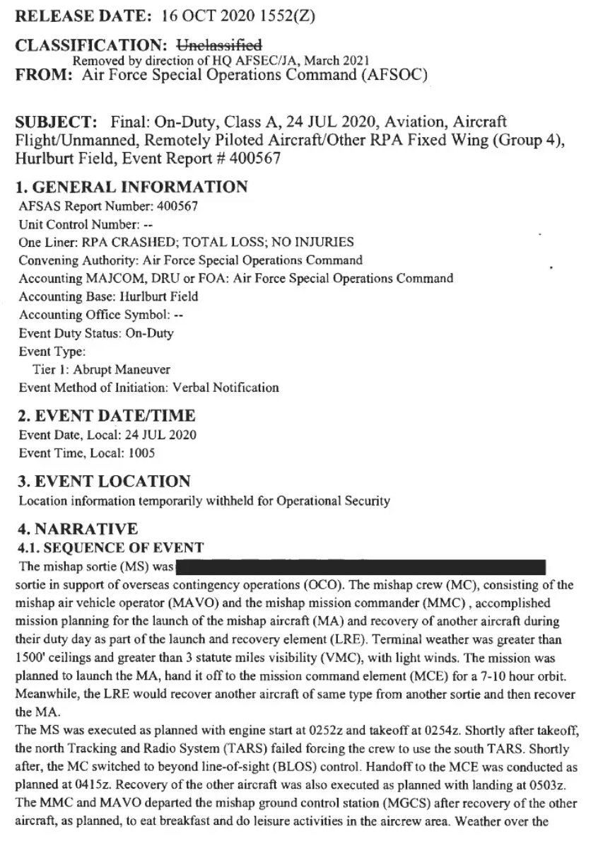 This confirmation came in the form of an official accident report that The War Zone obtained via the Freedom of Information Act, detailing the loss of one of the LEAP drones at Erbil International Airport in Iraq, on July 24, 2020. Although heavily redacted, the report stated that the drone was derived from the Pipistrel Sinus, making it distinct from the sport glider-based ULTRA.
