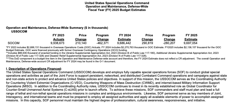 After years of budgetary and personnel growth in the fight against the Taliban, al-Qaeda and other Islamic extremists, SOCOM’s Fiscal Year 2025 presidential budget request is relatively flat, despite inflation. The $9.687 billion request represents a small increase of about $11 million over last year and a drop of $240 million from Fiscal Year 2023. That comes amid an increasing emphasis on planning for potential conflicts with state adversaries, namely China, Russia, Iran and North Korea, while still retaining capacity to fight violent extremists.