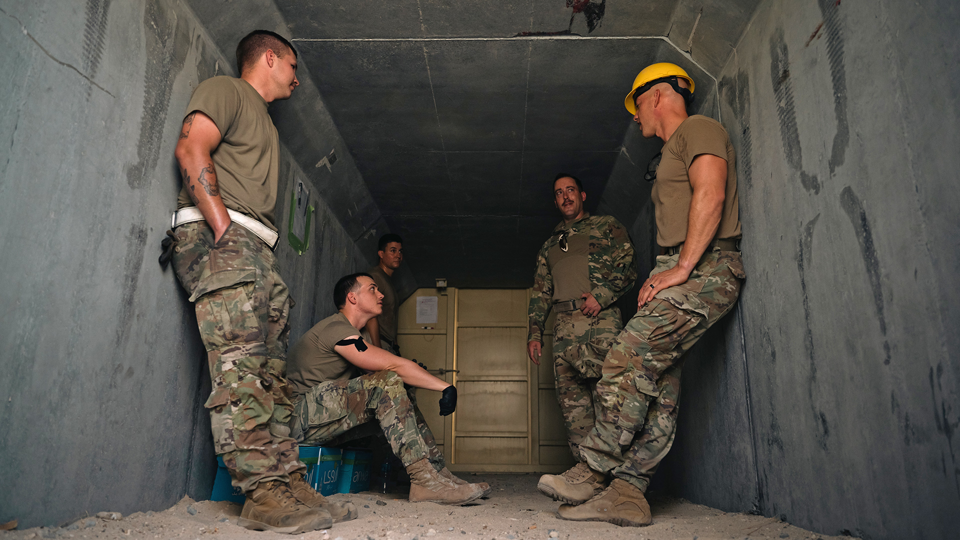 Airmen from the 386th Air Expeditionary Wing sit inside of a bunker during a base-wide exercise at an undisclosed location within the U.S. Central Command area of responsibility, May 24, 2024. The exercise assessed the responsiveness of Airmen and first responders during a simulated attack. (U.S. Air Force photo)