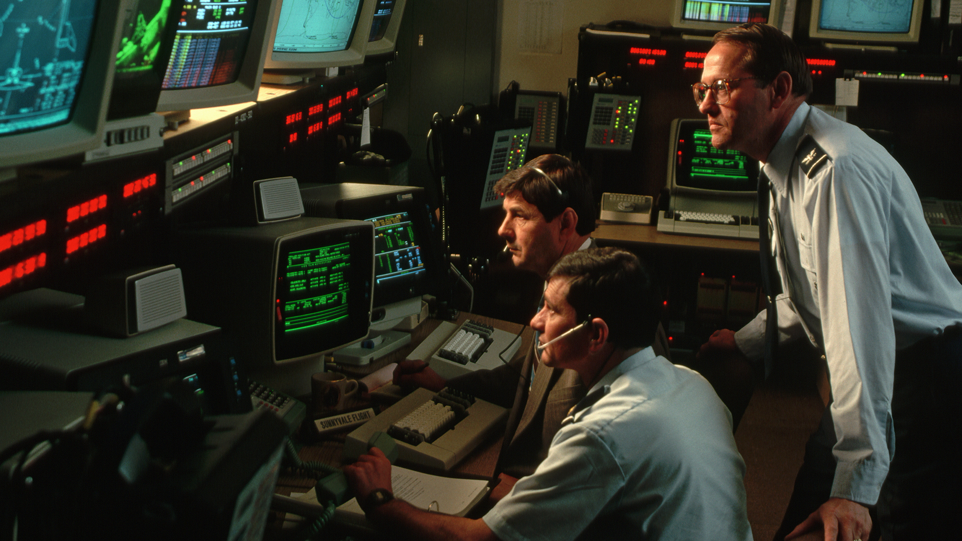 In a building called the “Blue Cube” on the military airbase, a group of Air Force officers and enlisted men montior the flight of the space shuttle. From this location the space shuttle is controlled after it is launched from Cape Canaveral in Florida. Typically the Air Force only monitors space flights with classified military cargo and equipment. | Location: Near San Jose, California, USA.