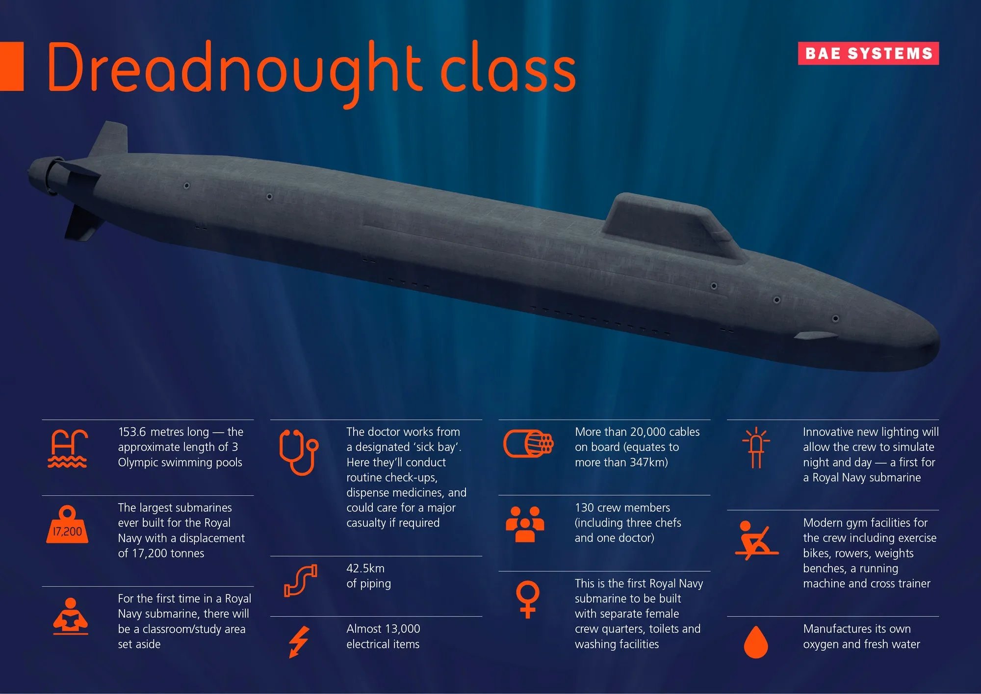 The Dreadnought class is scheduled to enter service starting in the early 2030s at a total estimated cost of around $43 billion. Armed with Trident submarine-launched ballistic missiles (SLBMs), the Dreadnoughts will replace a similar number of Vanguard class SSBNs now in Royal Navy service.