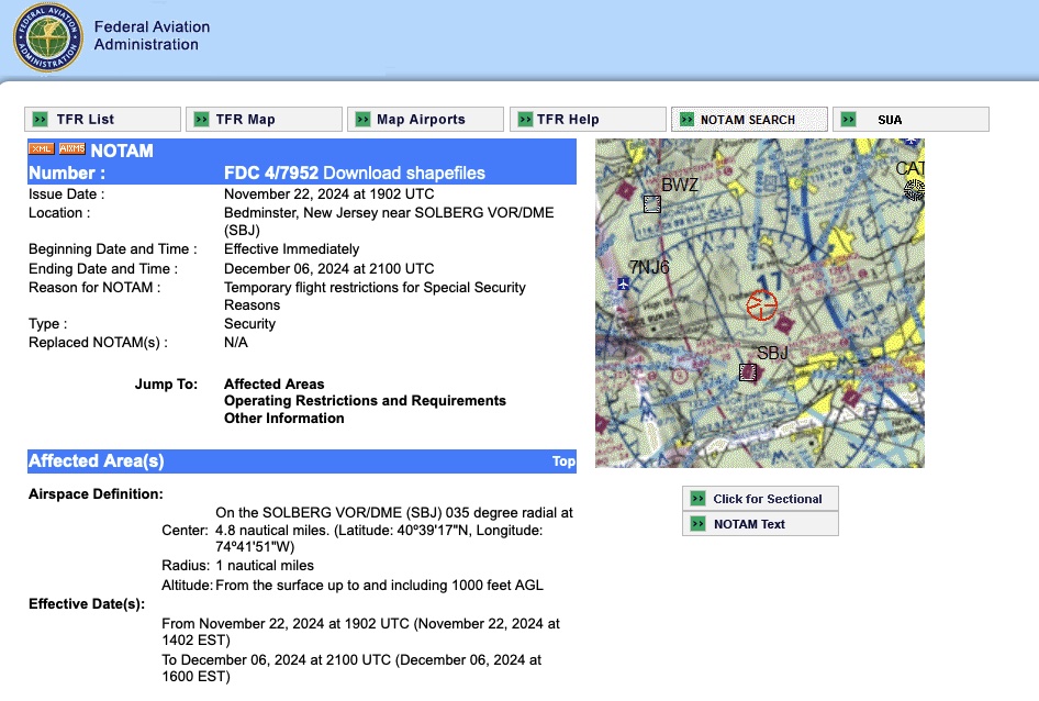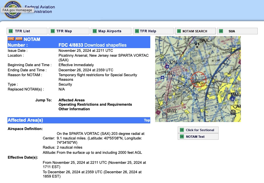 Responding to the spate of drone incursions, the FAA enacted two Temporary Flight Restrictions (TFRs) prohibiting drone flights without prior permission over Picatinny Arsenal and the Trump National Golf Course Bedminster without permission. The Picatinny TFR went into effect Nov. 25 and ends Dec. 26, while the one over Trump National was initiated Nov. 22 and slated to end Dec. 6, but was subsequently extended to Dec. 20.