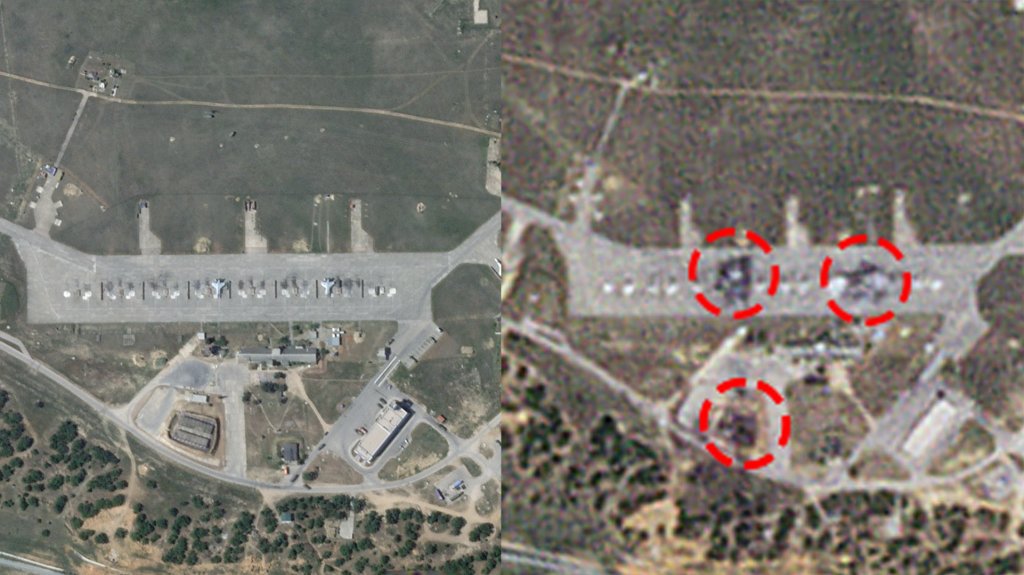 A low-resolution satellite image of Belbek taken earlier today that The War Zone obtained from Planet Labs clearly shows at least two large scorched areas on a section of the primary flightline located in the central area of the base. A pair of MiG-31s were seen at the same spots in a previous satellite image of the base shot on May 1st and the Foxhounds are regularly observed parked in this area.