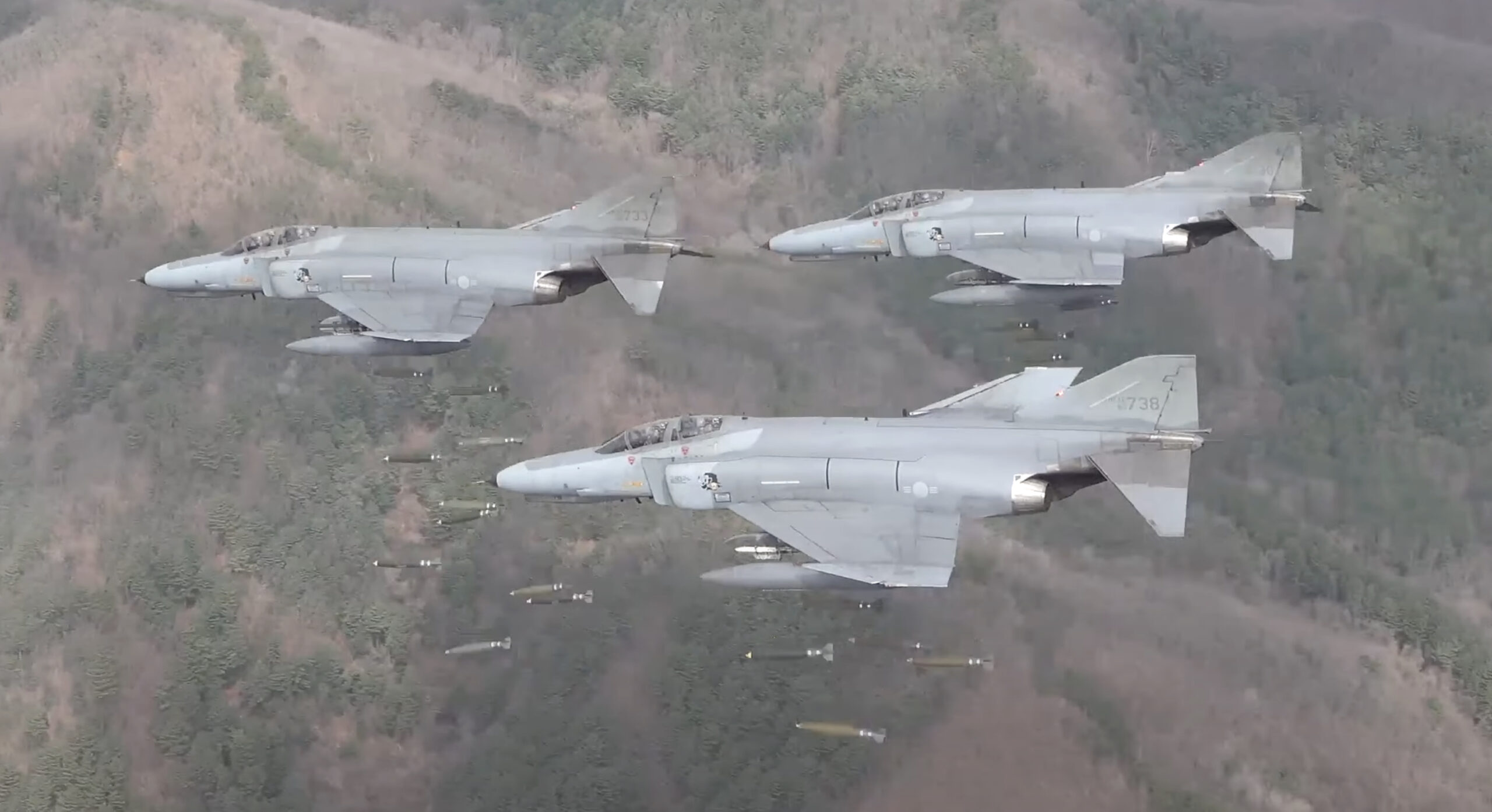 In addition to the live-fire exercise conducted on April 18, ROKAF F-4Es also recently performed live-fire exercises with Mk 82 500-pound bombs earlier on April 5, seen in the Yu Yongwon TV video. Three F-4Es, each loaded with 10 Mk 82s, can be seen taking to the sky in the footage — the F-4E can be equipped with up to 24 of the bombs in total.