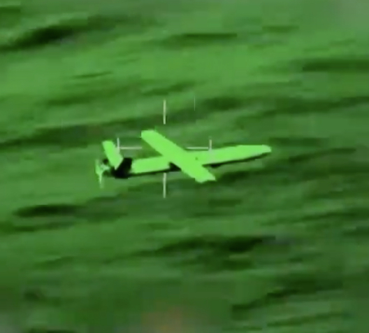 Then, the perspective shifts again, with the video indicating that the helicopter flew alongside the drone to shoot it down with its door-mounted machine gun. The machine gun can be heard before the drone is no longer seen.