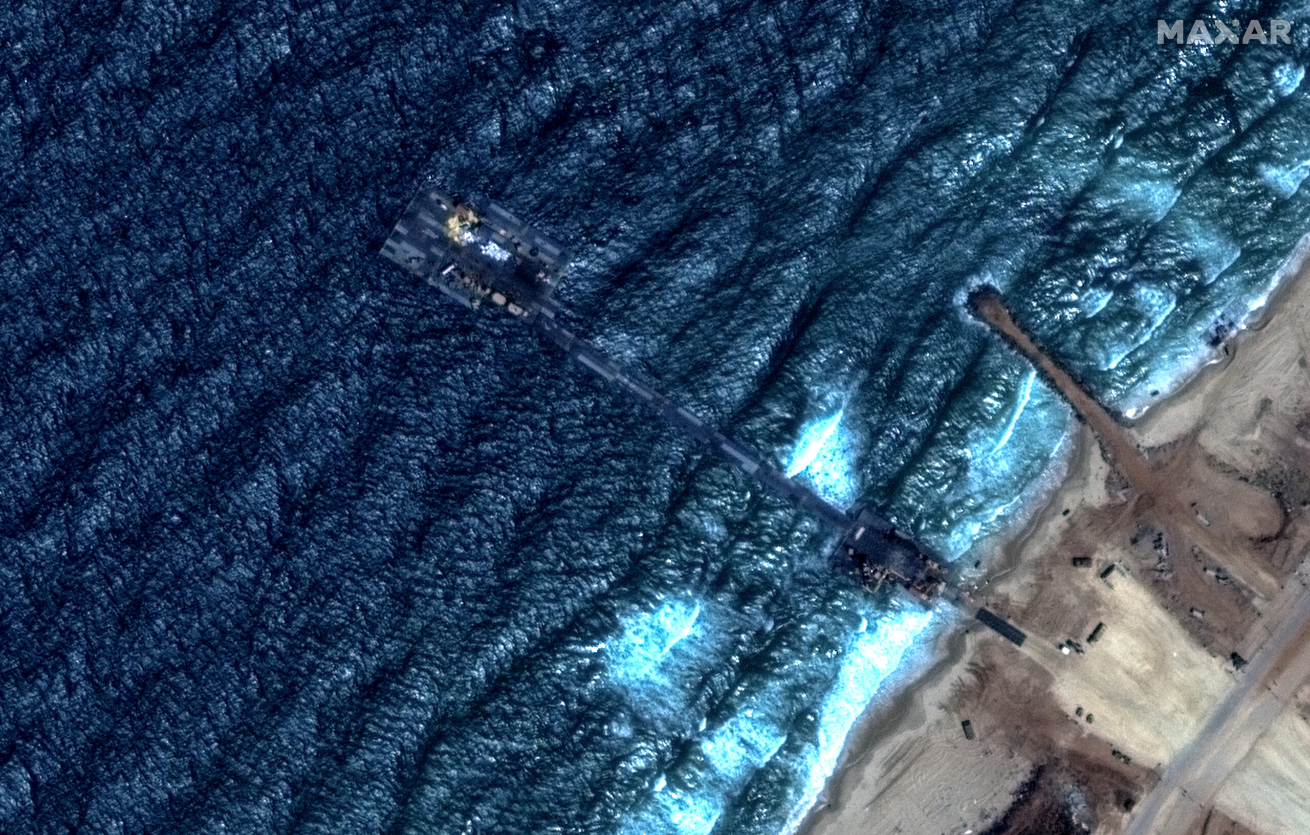 The satellite image of the storm damaged pier was taken days after CENTCOM officials acknowledged that four U.S. Army vessels supporting the maritime humanitarian aid mission “broke free from their moorings,” CENTCOM said in a May 25 media release.