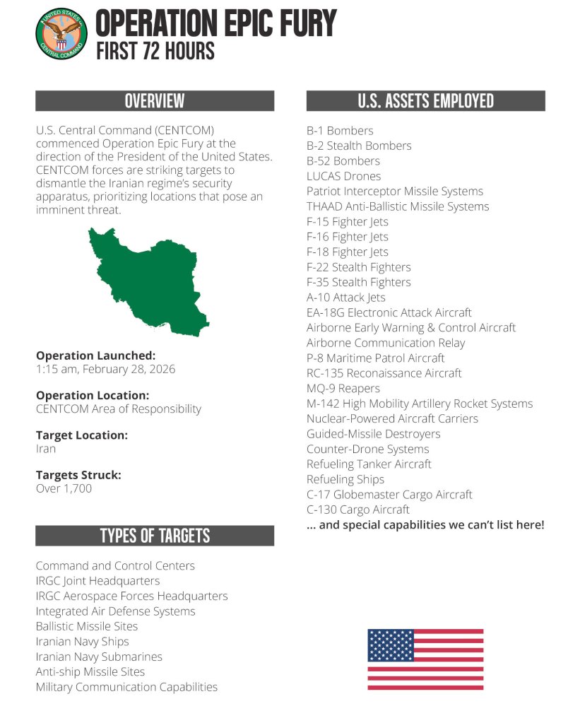 U.S. Air Force B-52 bombers have joined the air campaign against Iran, according to a new fact sheet from U.S. Central Command seen below. American forces have now struck more than 1,700 targets in total.