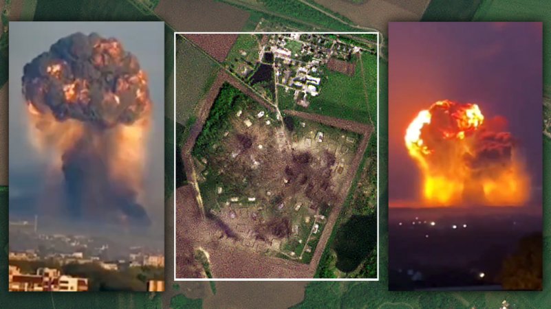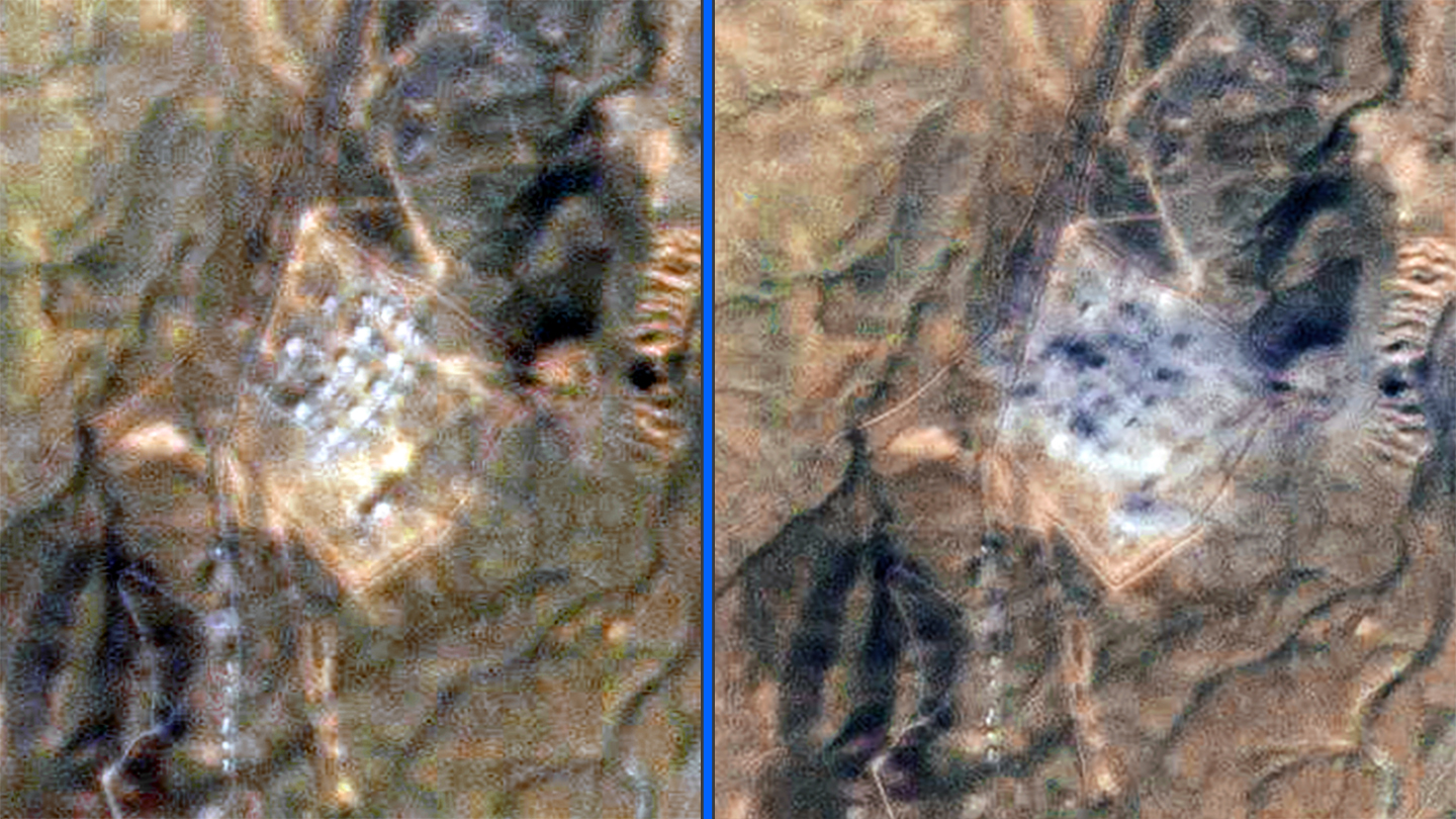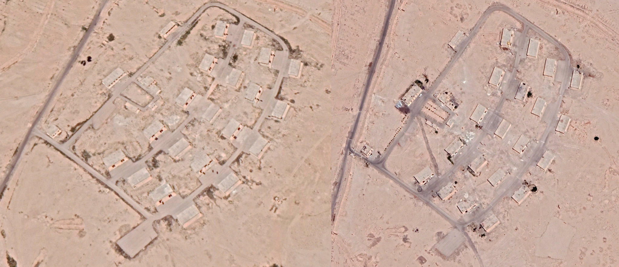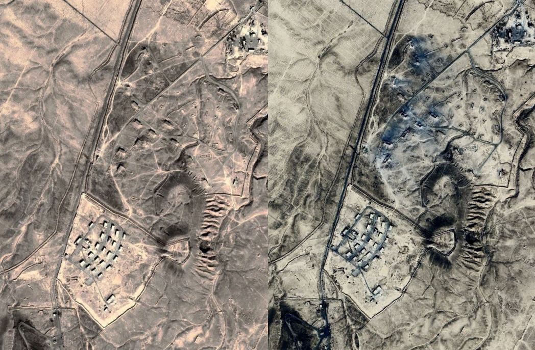 Pre-strike and post-strike imagery shows the munitions storage installation turned into a series of burned craters.