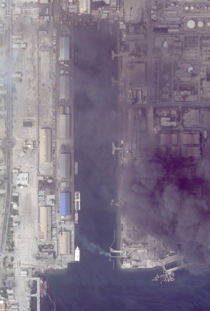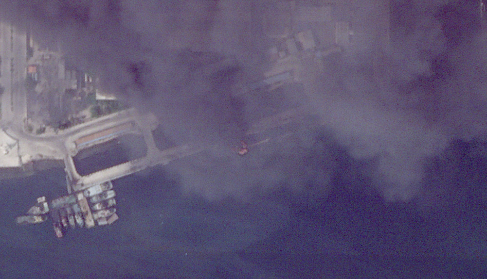 Thick black smoke is seen over much of the central portion of the facility. A smaller plume of smoke is also seen rising from an impact point on a pier. Other areas of the facility look less impacted, at least from what is visible in the image.