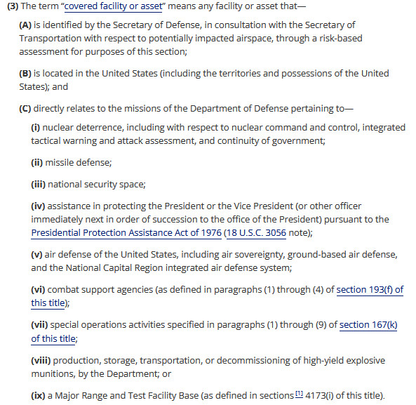 There are notable caveats about the “covered facility or asset[s]” the law applies to, as well. A specific list provided in the statute is focused largely on top-tier national security sites and assets, including those related to nuclear deterrence, protecting the President and Vice President, the nation’s air and missile defense networks, and space launch activities. The U.S. military does also reserve its inherent right to act outside of this authority in self-defense.