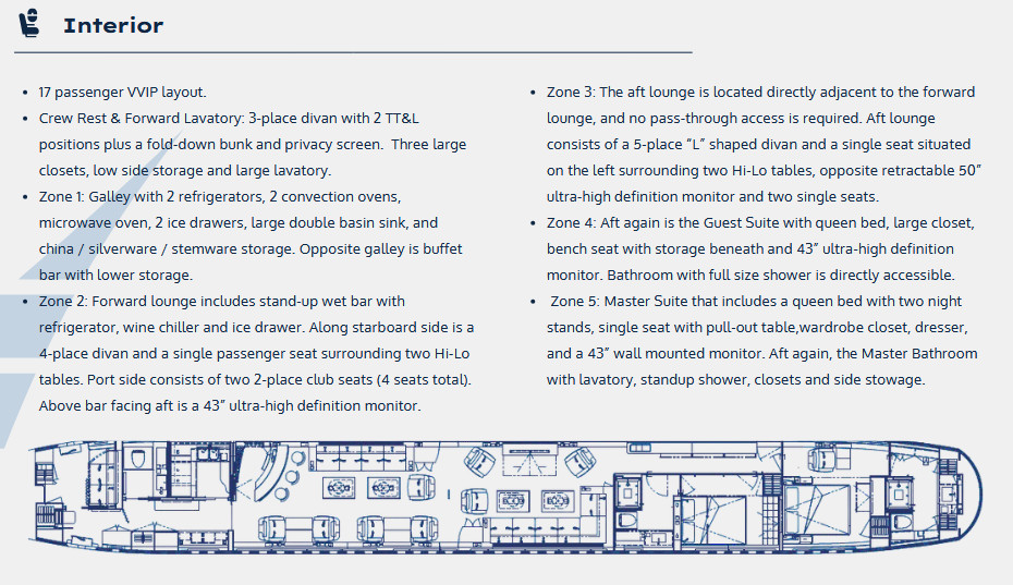 Avjet’s brochure says the jet has a “5 zone VVIP cabin configuration” designed to accommodate 17 passengers. Accompanying pictures show an extremely luxurious interior layout that includes two suites with full-size beds and a master bathroom with a shower stall, among many other amenities. Whether any changes have since been made to the aircraft’s internal configuration is unknown, but there are no indications that it has. It would be expensive and time-consuming to make major changes to the core internal layout. Doing so would also call into question the basic rationale for any buyer to select this particular low-time VIP aircraft rather than a 737 in a more basic configuration, to begin with.