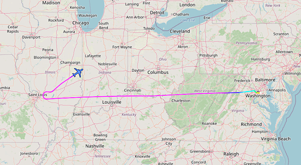 On December 12, N471US then made a circuitous trip to the Grissom Aeroplex in Peru, Indiana, by way of the St. Louis, Missouri, area, much further to the west, where it did not land. The Grissom Aeroplex is collocated with Grissom Air Reserve Base, a major hub for Air Force Reserve aerial refueling tankers. It then returned to the Washington, D.C. area on December 13, where it was spotted at National Airport.