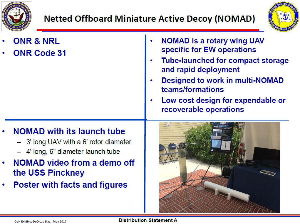 “NOMAD is a rotary wing UAV specific for EW operations” that is “designed to work in multi-NOMAD teams/formations” and has a “low cost design for expendable or recoverable operations,” according to a Navy briefing slide, seen below, discussing that project.