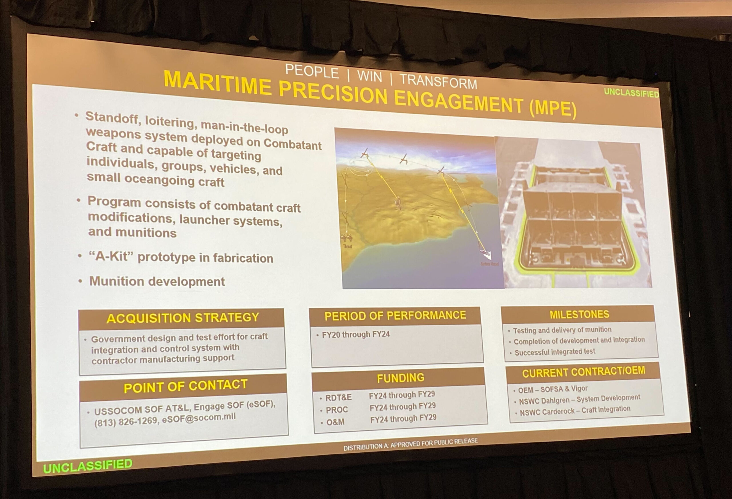 “Maritime precision engagement, as you can see, this is a stand-off, loitering… man-in-the-loop, guided munition,” Cdr. Burns said on Tuesday. “So where are we at with this? Currently, we’re integrating [the system] within a CCM, an operational craft, CCM 11.”