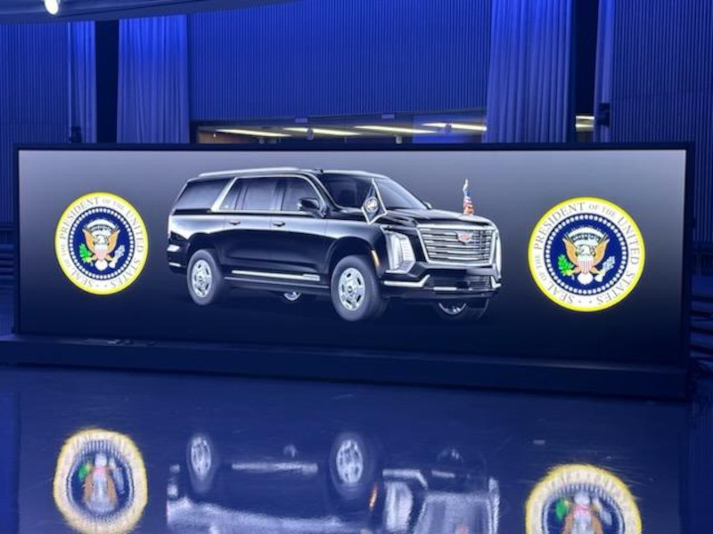 An accompanying picture from Curran’s visit with GM, seen below, showed an image on display at the GM site featuring a newer generation Escalade flanked by seals of the office of the President of the United States. The presence of the seals pointed to a configuration intended for use as a presidential limo role.
