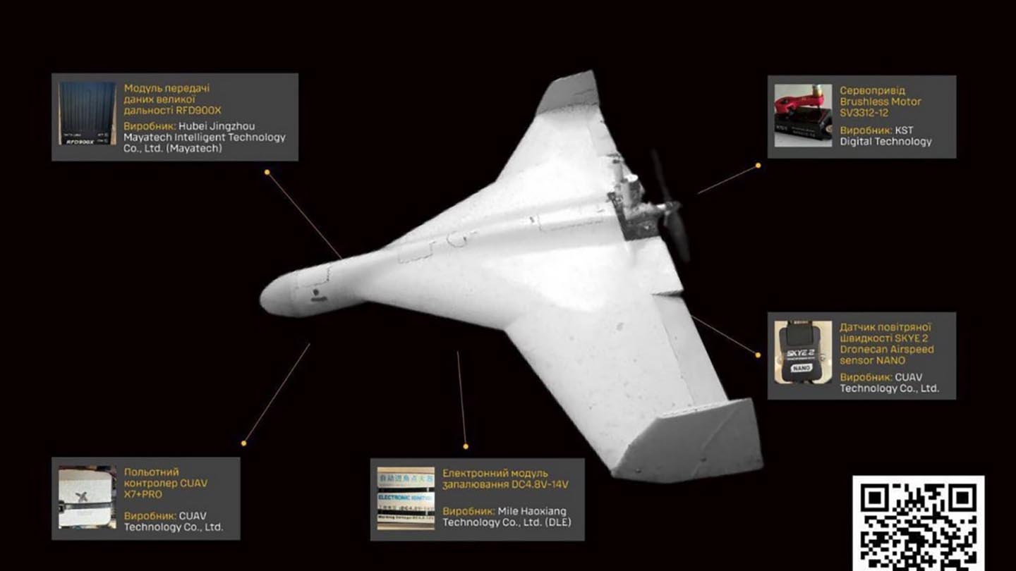 GUR recovered at least two of these drones, the second of which contained two components of unknown origin. Nearly half of the parts in the first drone come from one company, CUAV Technology. Those parts include a flight controller with an autopilot, navigation modules and antennas, and an airspeed sensor with a pilot tube, GUR stated.