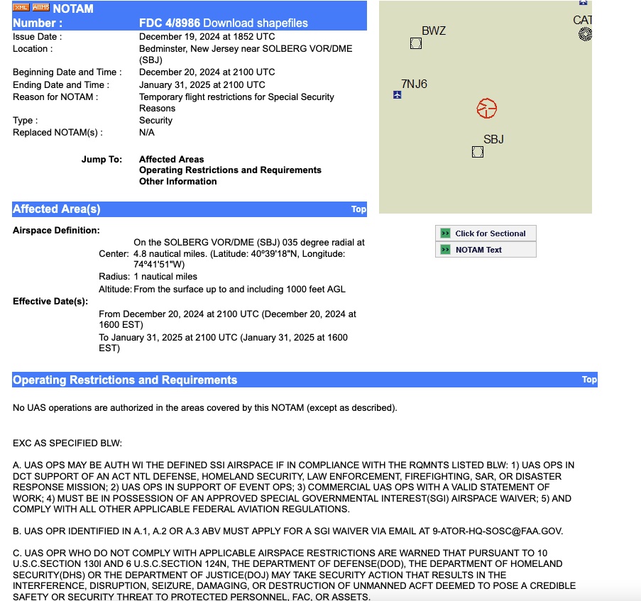 After the public outcry over the drone sightings, the FAA issued scores of Temporary Flight Restrictions (TFRs) warning operators away from flying drones largely over power facilities in New Jersey. Not long after, these expanded to New York. Some 22 installations were initially put under TFR in the former and a whopping 68 in the latter. This number grew further not long after. It is not clear what intelligence, if any, led to this action. In addition, TFRs were imposed over Picatinny Arsenal and the Trump National Golf Club Bedminster among other locations. All but the one over Bedminster expired and were not renewed. The one over Bedminster was extended through Jan 31. The club was under regular TFRs, especially during Trump’s time in office whenever he was present there.