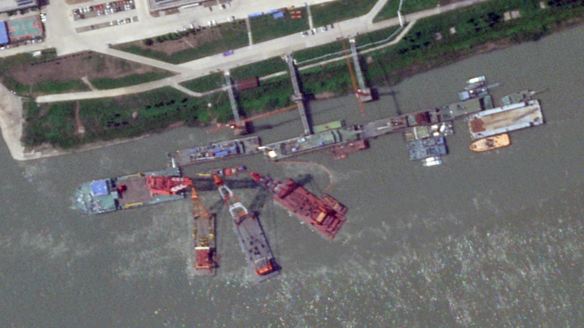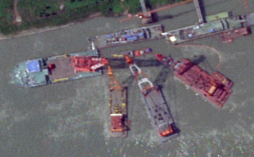 A further review of imagery available from Planet Labs shows the cluster of four crane barges in place at least from June 12 through June 17. The submarine that had been in the berth in May is absent during those dates, but it is not clear when exactly it was last seen. By the first week of July, the barges are gone and activity at Wuchang appears to have returned to normal.