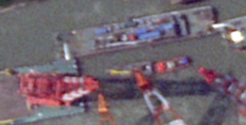 “I acquired an [satellite] image [from Planet Labs] from June 13th. In the image, there appears to be what look like crane barges clustered around…something…near where the submarine was earlier,” Shugart continued. “Also, the floating pier where the submarine was moored appears to have been offset a bit.”