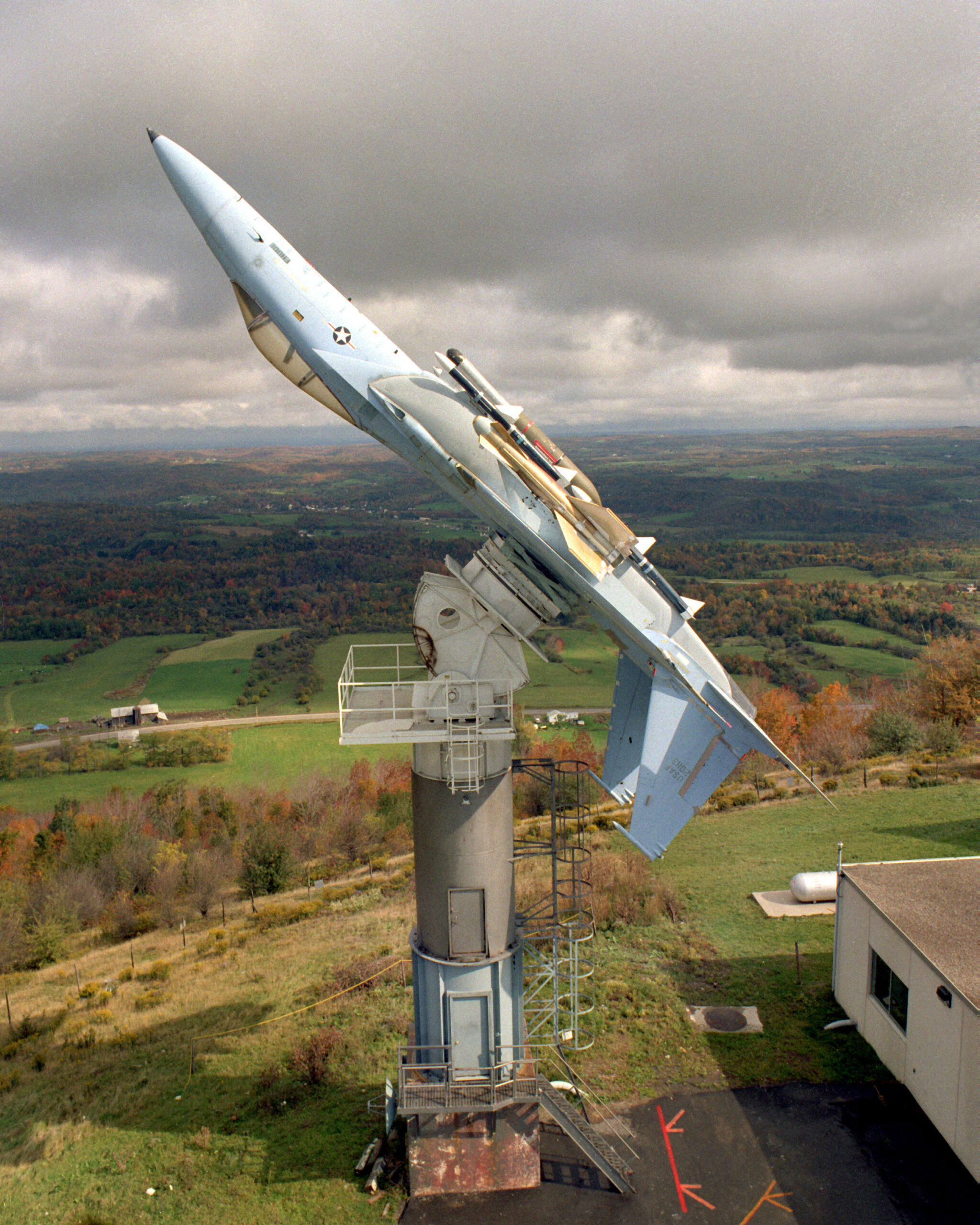 For static testing, on the other hand, aircraft were separated by size. At the Newport test facility, located approximately 18 miles from Griffiss and consisting of several ranges, smaller aircraft testing was conducted, notably involving fighters and attack aircraft. From as early as 1972, RADC initiated efforts to investigate antenna measurement patterns of an ECM pod-equipped F-4 aircraft, for example.