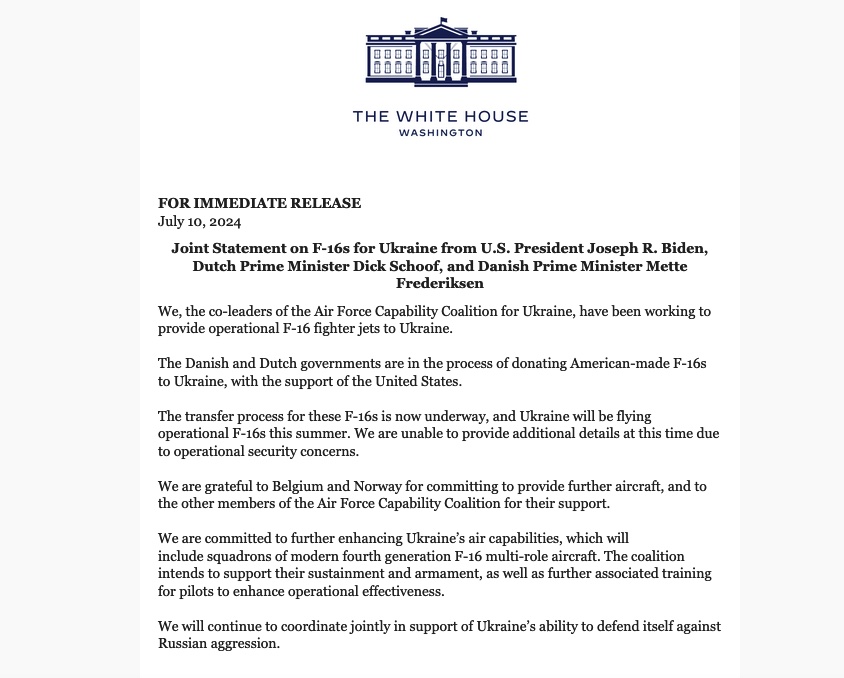 U.S. President Joe Biden, Dutch Prime Minister Dick Schoof, and Danish Prime Minister Mette Frederiksen issued a joint statement on the F-16s Wednesday. They are being provided under an Air Force Capability Coalition for Ukraine.