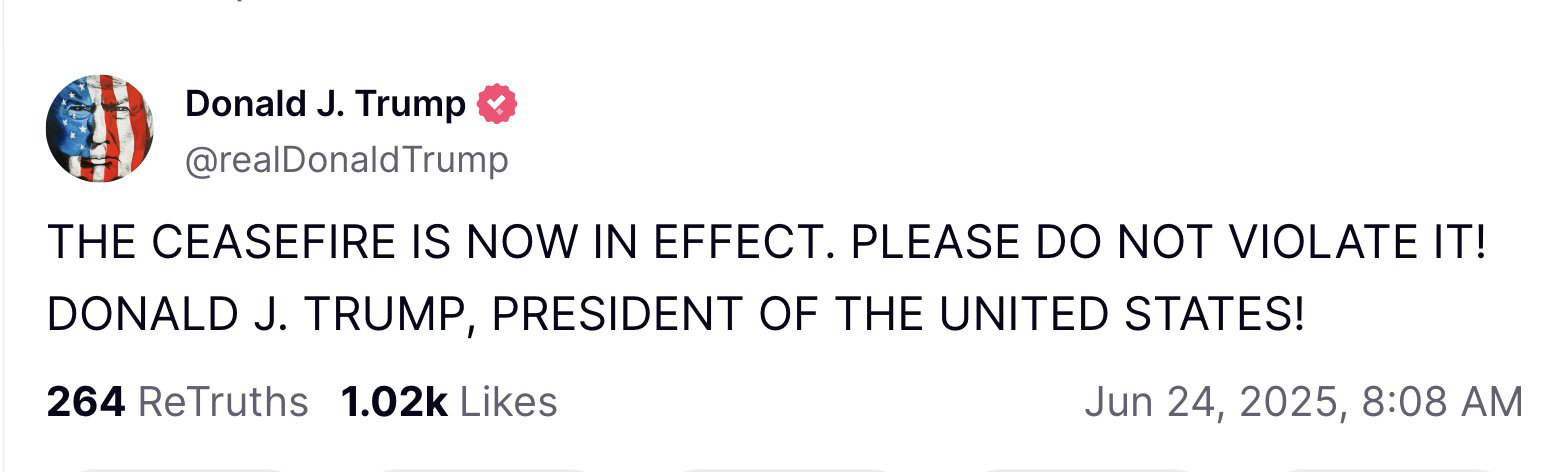 Trump said that Iran will start the ceasefire “and, upon the 12th Hour, Israel will start the CEASEFIRE and, upon the 24th Hour, an Official END to THE 12 DAY WAR will be saluted by the World,” Trump continued. “During each CEASEFIRE, the other side will remain PEACEFUL and RESPECTFUL. On the assumption that everything works as it should, which it will, I would like to congratulate both Countries, Israel and Iran, on having the Stamina, Courage, and Intelligence to end, what should be called, “THE 12 DAY WAR.” This is a War that could have gone on for years, and destroyed the entire Middle East, but it didn’t, and never will! God bless Israel, God bless Iran, God bless the Middle East, God bless the United States of America, and GOD BLESS THE WORLD!”