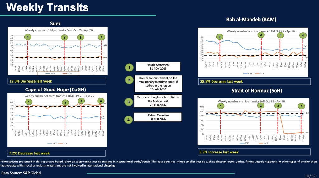 The maritime security environment across the Arabian Gulf, Gulf of Oman, and Strait of Hormuz “remains CRITICAL, driven by recent attack patterns, continued navigation interference, and persistent operational disruption, including impacts to port activity,” according to the latest update from the Joint Maritime Information Center (JMIC). Despite the April 8 ceasefire, “commercial traffic remains limited, with constrained transits and continued routing uncertainty.”