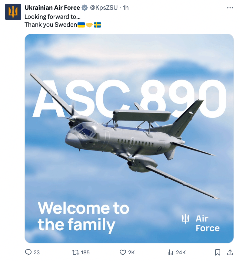 The Swedish government today announced details of what it calls Military Support Package 16, worth around $1.25 billion and focused on “collective air defense.” At the core of this is the Saab 340 AEW&C aircraft — which is known in Swedish military service as the ASC 890 and alternatively as the S 100D Argus. The Swedish Air Force operates two of these aircraft and the wording of statements from Swedish and Ukrainian officials suggest that both will be provided to Kyiv, although this is so far unconfirmed.