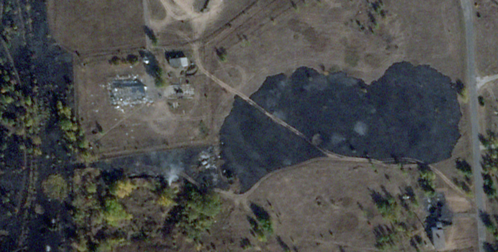 The image below shows that the aircraft on the apron appear to be unscathed while there are three large burn marks, one in between the flight line and apron, one just to the southeast of it bracketing the apron, and another just to the southeast of the flight line.