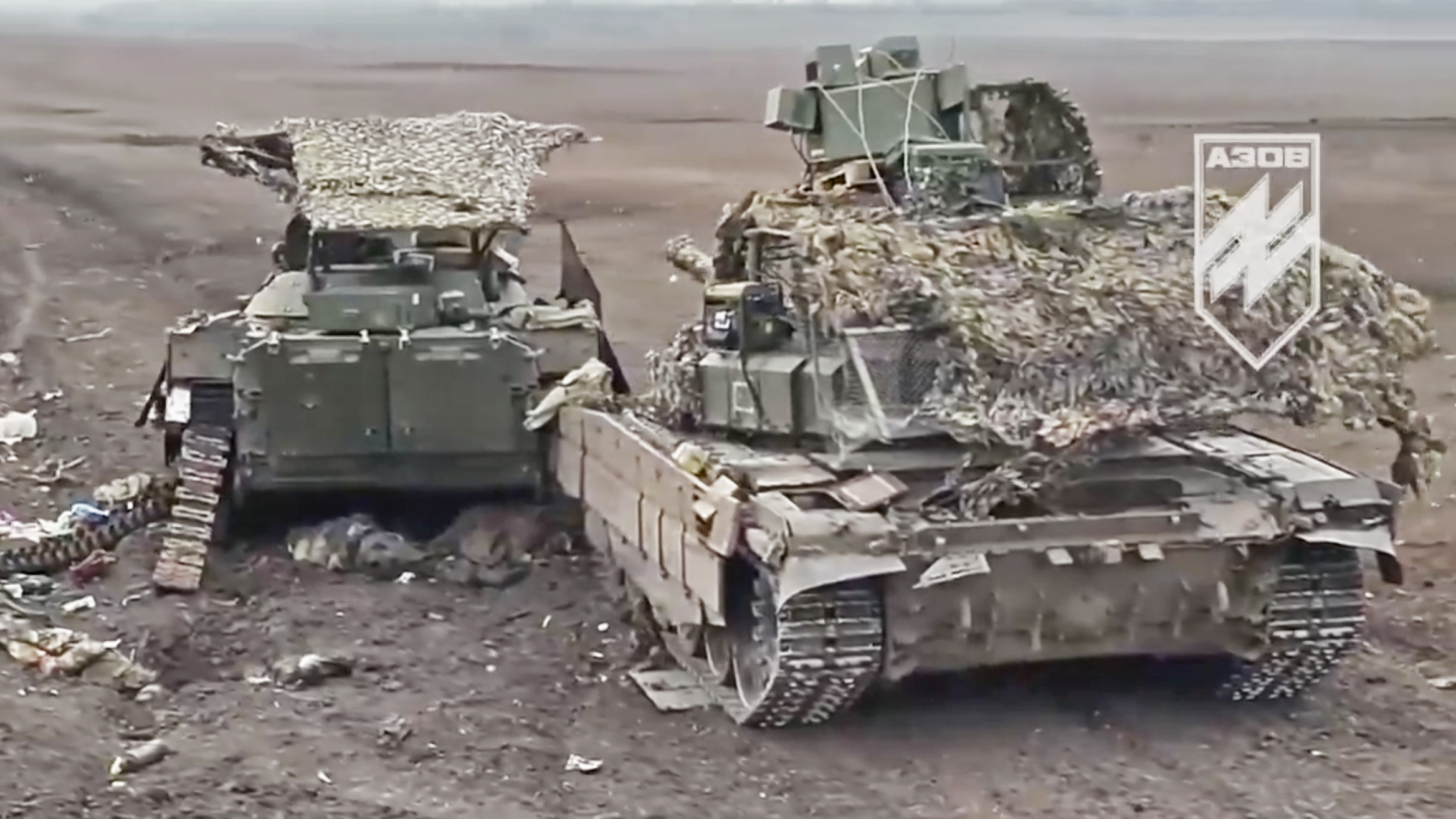 The electronic warfare system-hauling tank, with multiple boxes associated with counter-drone electronic warfare jamming equipment, including what look like phased arrays of some kind, strapped to its turret, was first noted in a video showing FPV strikes by Ukraine’s 60th Mechanized Brigade on a Russian formation. As well as the adapted T-72 — apparently a T-72B3M obr 2022 version — a BTR-82 armored personnel carrier also came under attack.