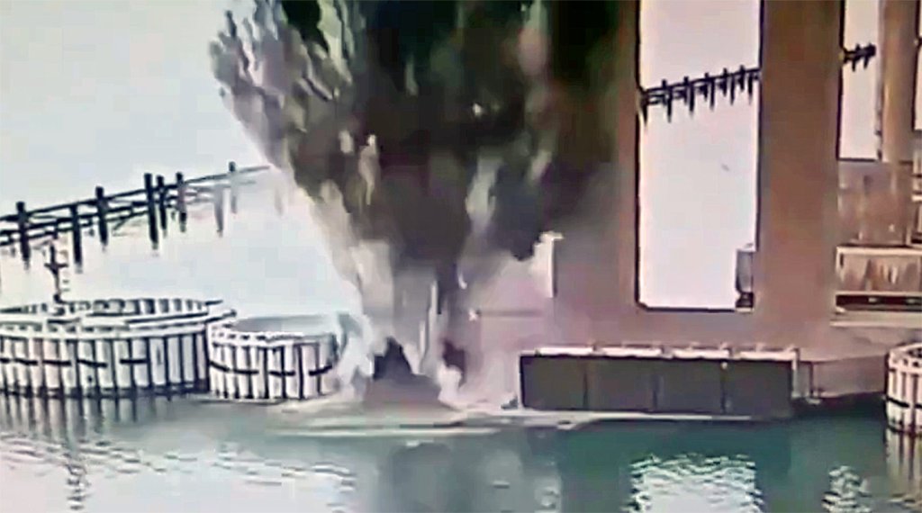 The explosion is geolocated to the southeastern pylon for the section of the bridge where ships pass under, on the Sea of Azov side.