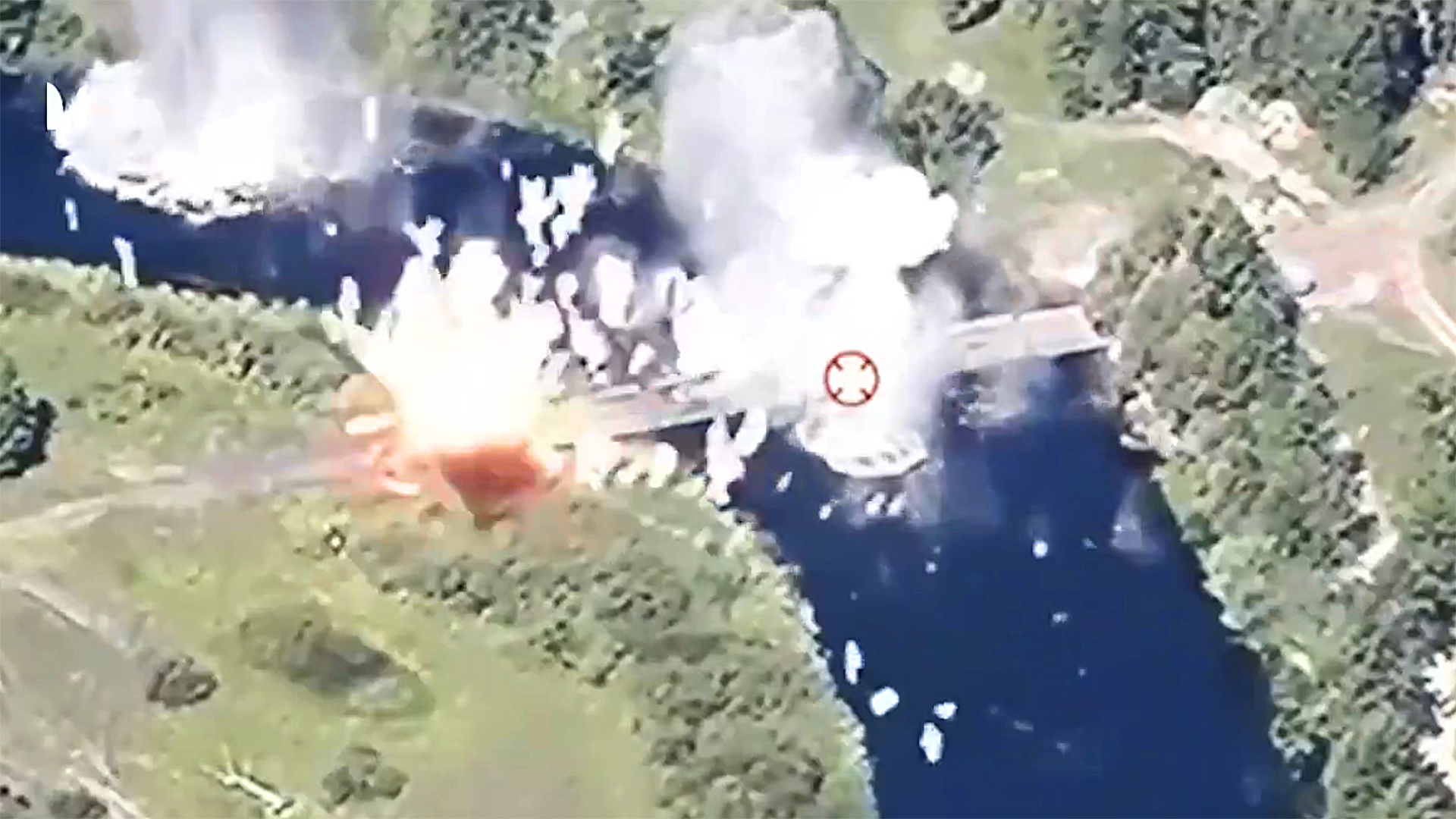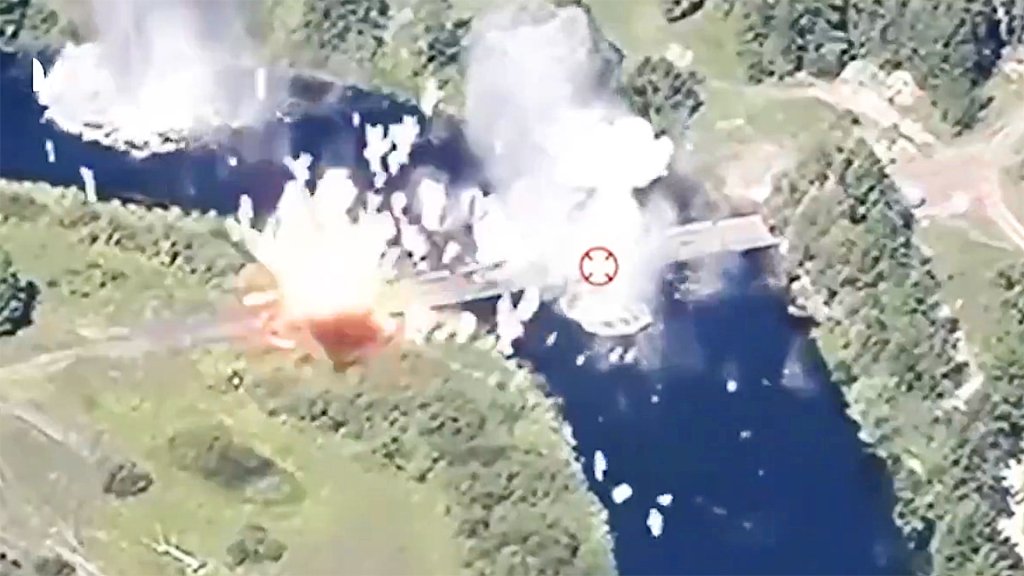 Today, new video emerged showing those make-shift spans and equipment near them being struck by cluster munitions. You can see the submunitions widely scattered around the bridge and other targets.