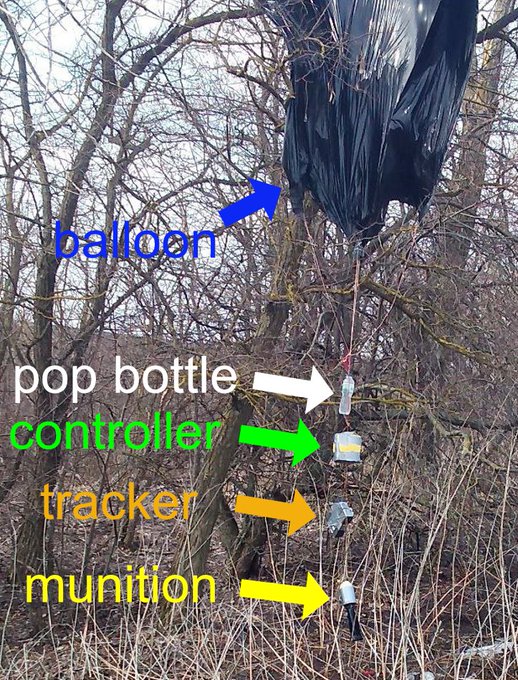 In his Twitter thread, Daniel R posted almost a dozen pictures showing the balloons and components, which include a controller, munitions, a GPS tracker sending signals to a satellite, a Bluetooth module he claimed is “the brains” of the balloon and curiously an empty plastic soda bottle.