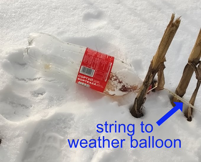 Like the Ukrainian balloons found in Russia last month, the Russian balloons also had plastic soda bottles attached to them, as you can see in this image below. It was posted Monday by Twitter user Daniel R.