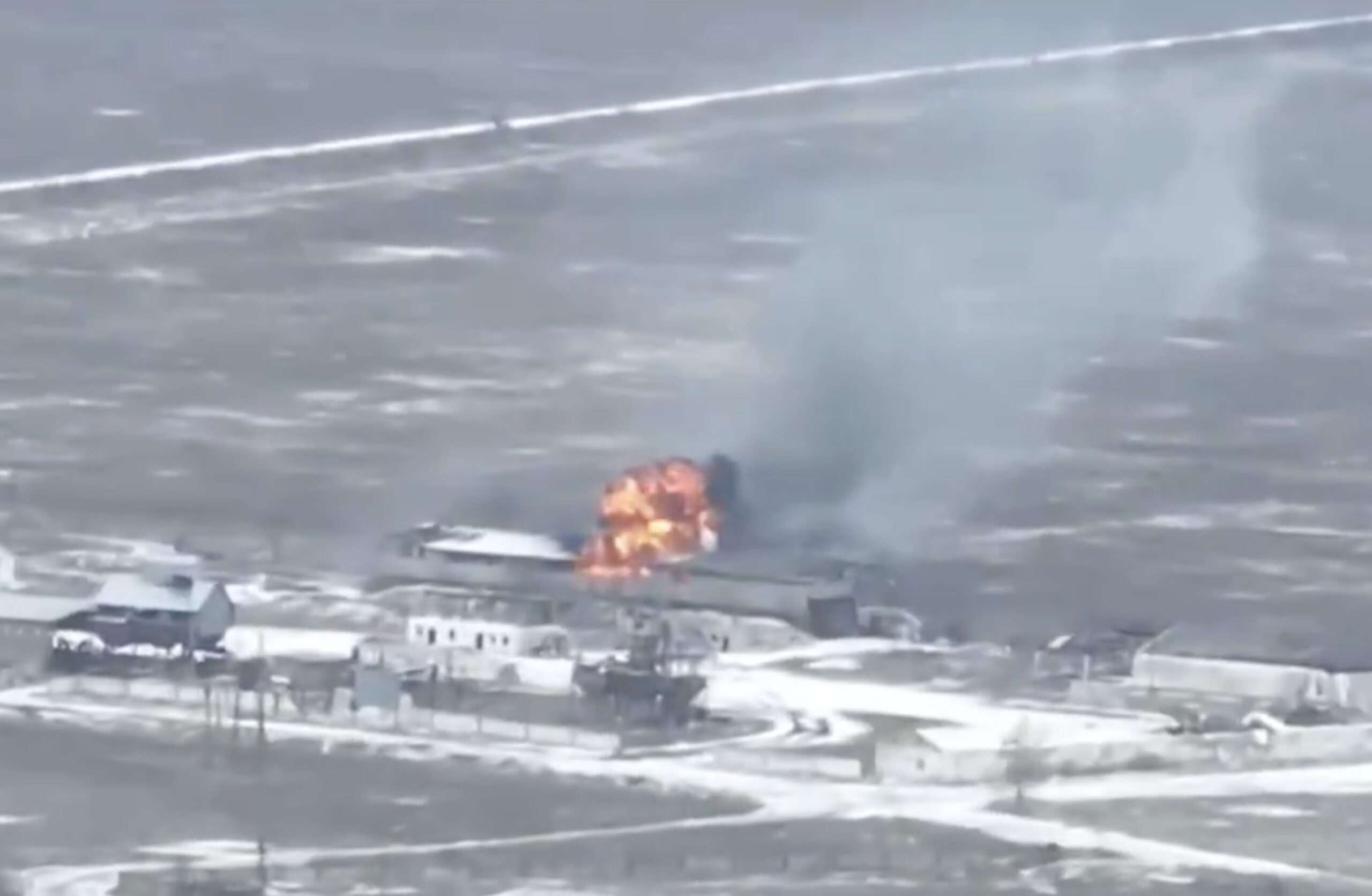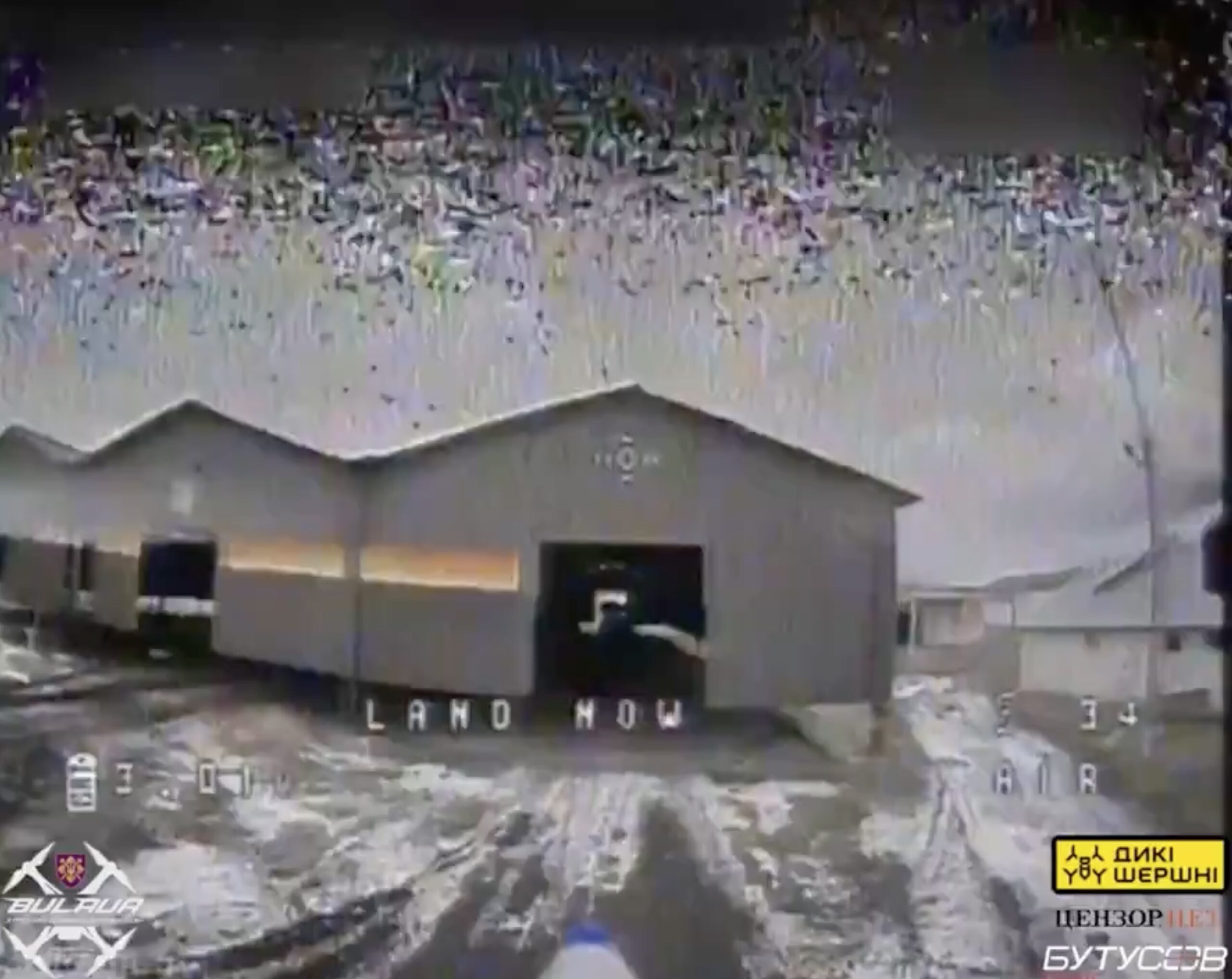 The two-minute, 14-second-long video begins with one of the FPV munitions slowly entering one of the warehouses via a large, uncovered entrance.