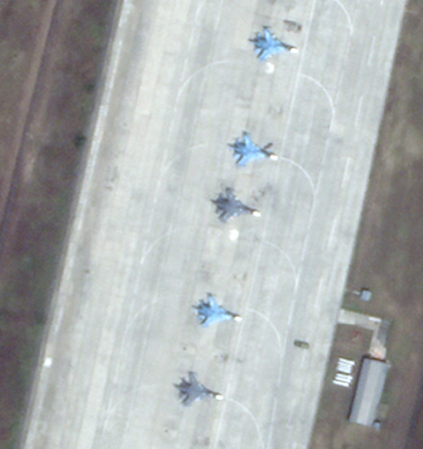 There is significant discoloration visible on the tarmac at one of two main aprons at the base, but this appears to simply reflect normal flying operations. Older satellite imagery, including as far back as last year, shows similar blackened areas, which appear to have been caused by normal seeping of various fluids and engine run-ups.