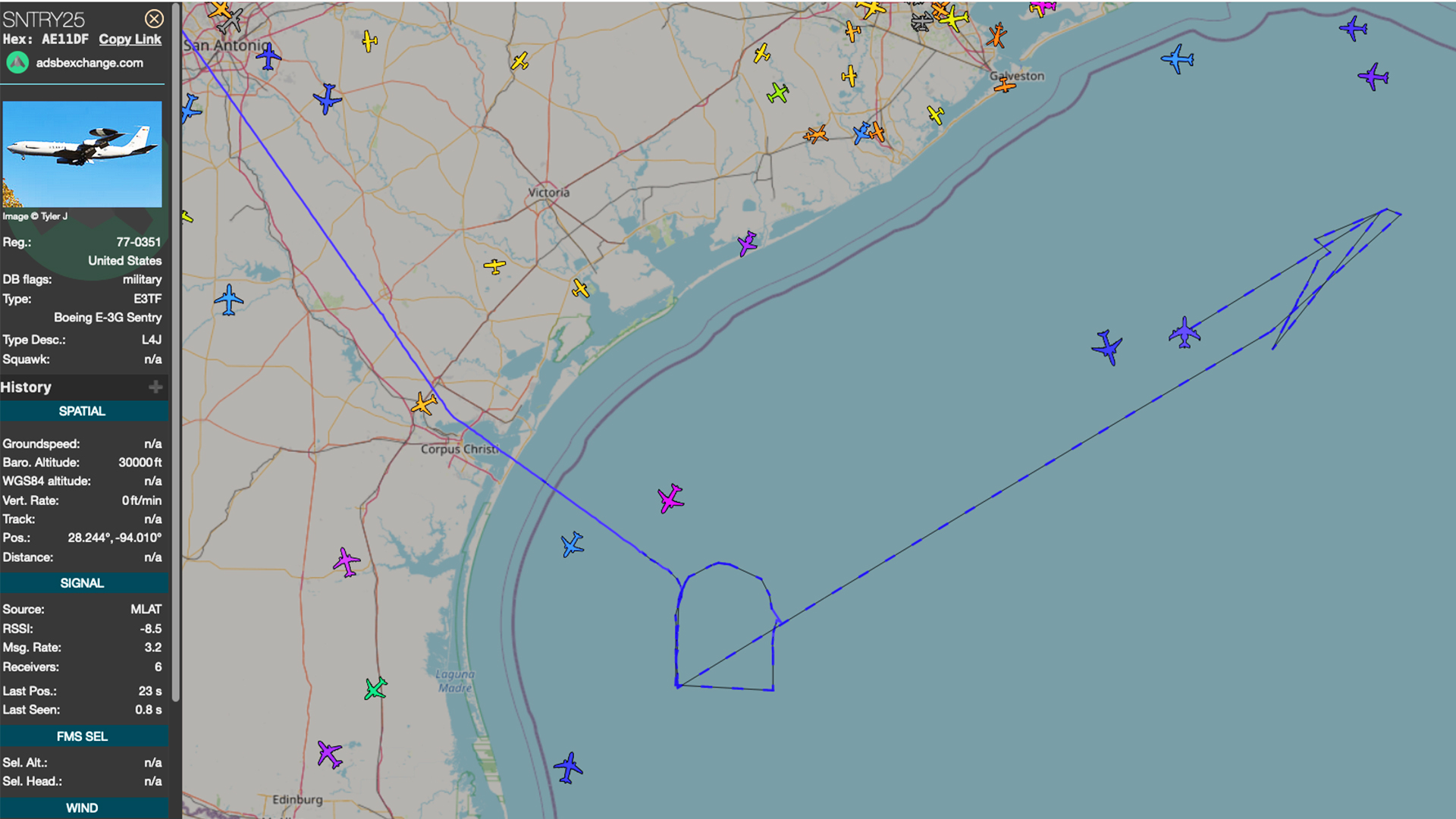 We started getting word of an intercept operation occurring when radio enthusiasts reported the odd operation underway. The E-3 and the fighter-supporting KC-135 tanker were subsequently spotted on radar tracking software ADSBExchange.com flying orbits in the area in question.